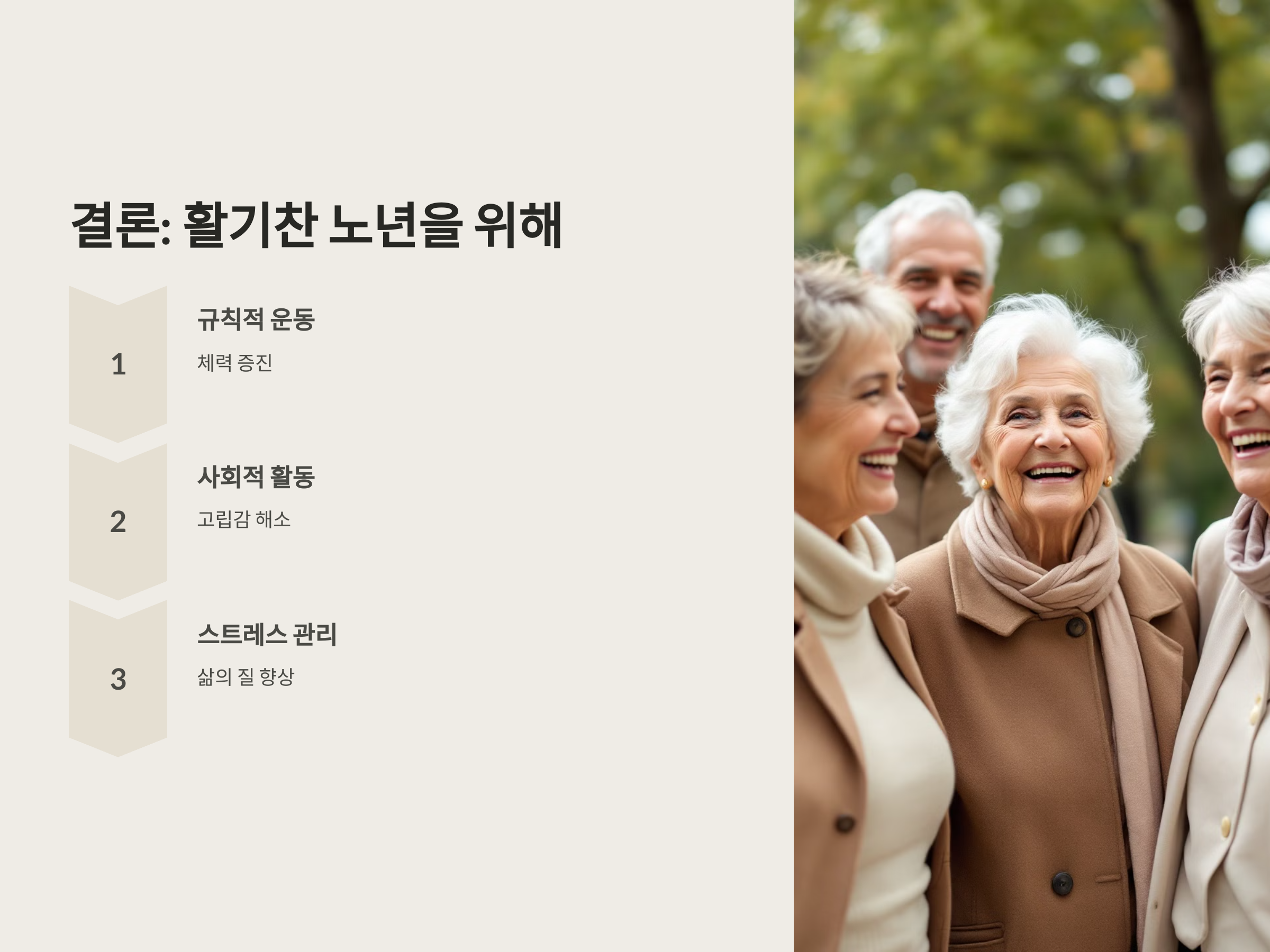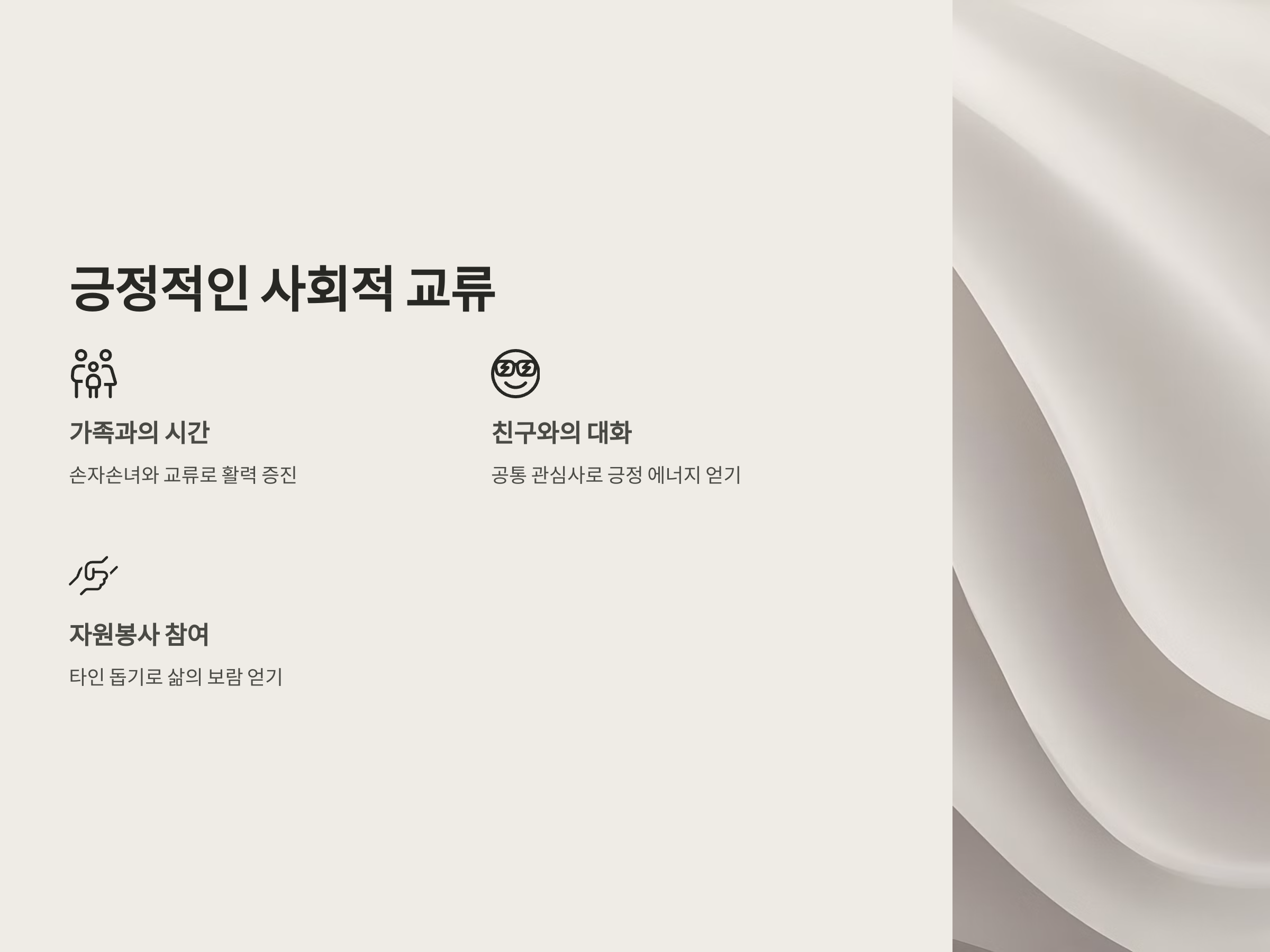 사회적 활동은 외로움을 해소하고 정서적 안정을 유지하는 데 도움을 줍니다.