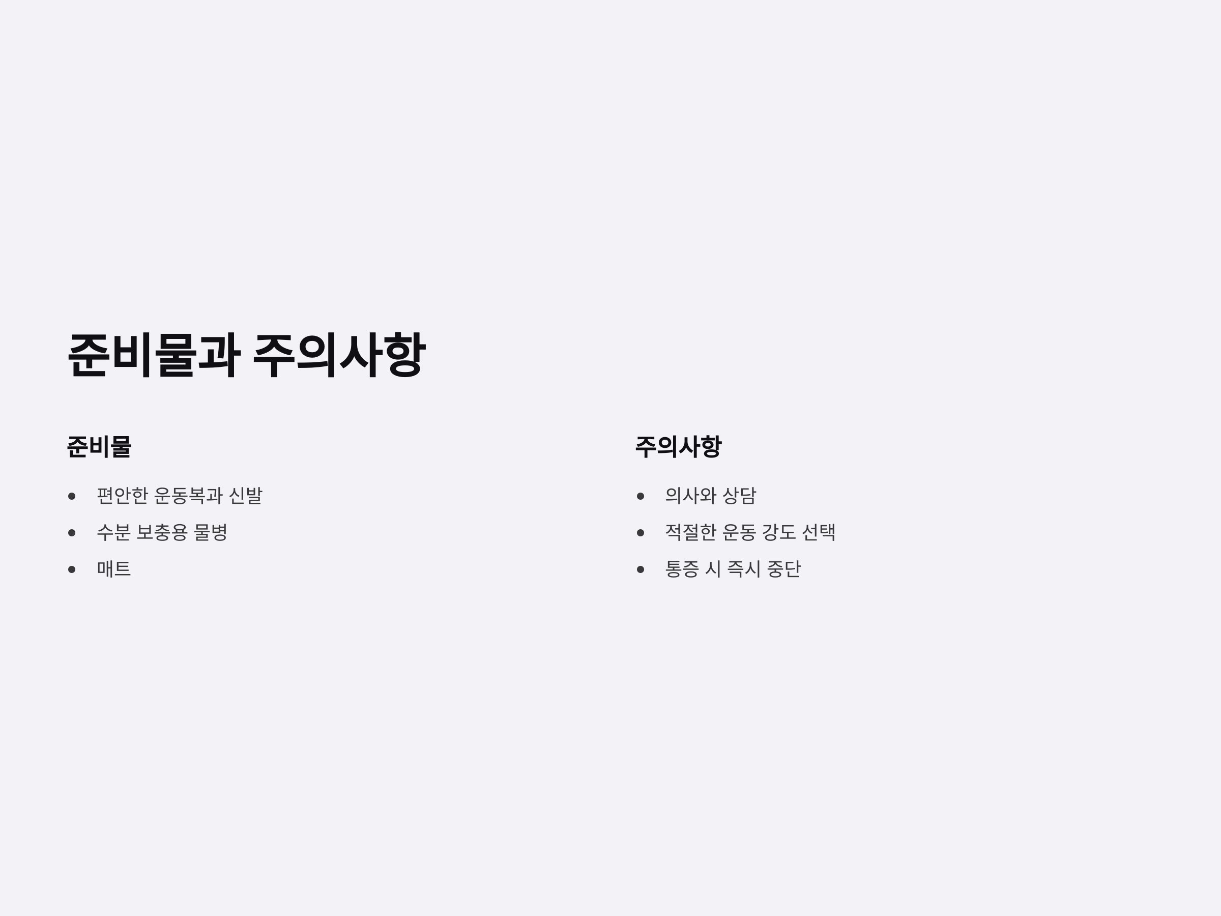 - 편안한 운동복과 신발: 충격 흡수가 좋은 신발을 착용하세요.