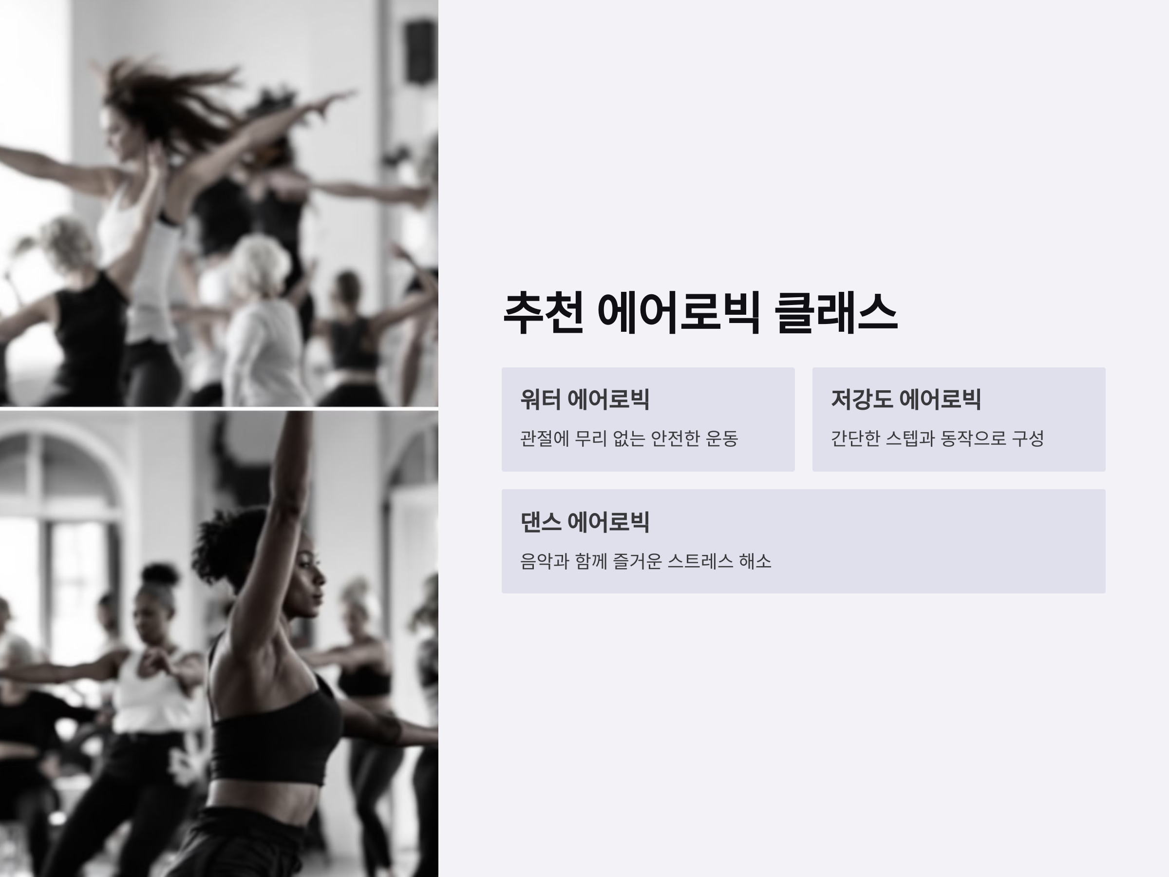 - 워터 에어로빅: 물의 저항을 활용해 관절에 무리가 가지 않는 안전한 운동입니다.