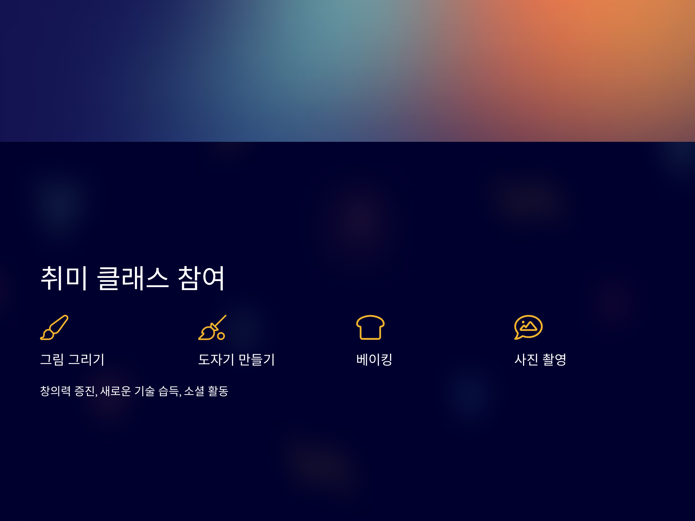 - 인기 취미: 그림 그리기, 도자기 만들기, 베이킹, 사진 촬영.