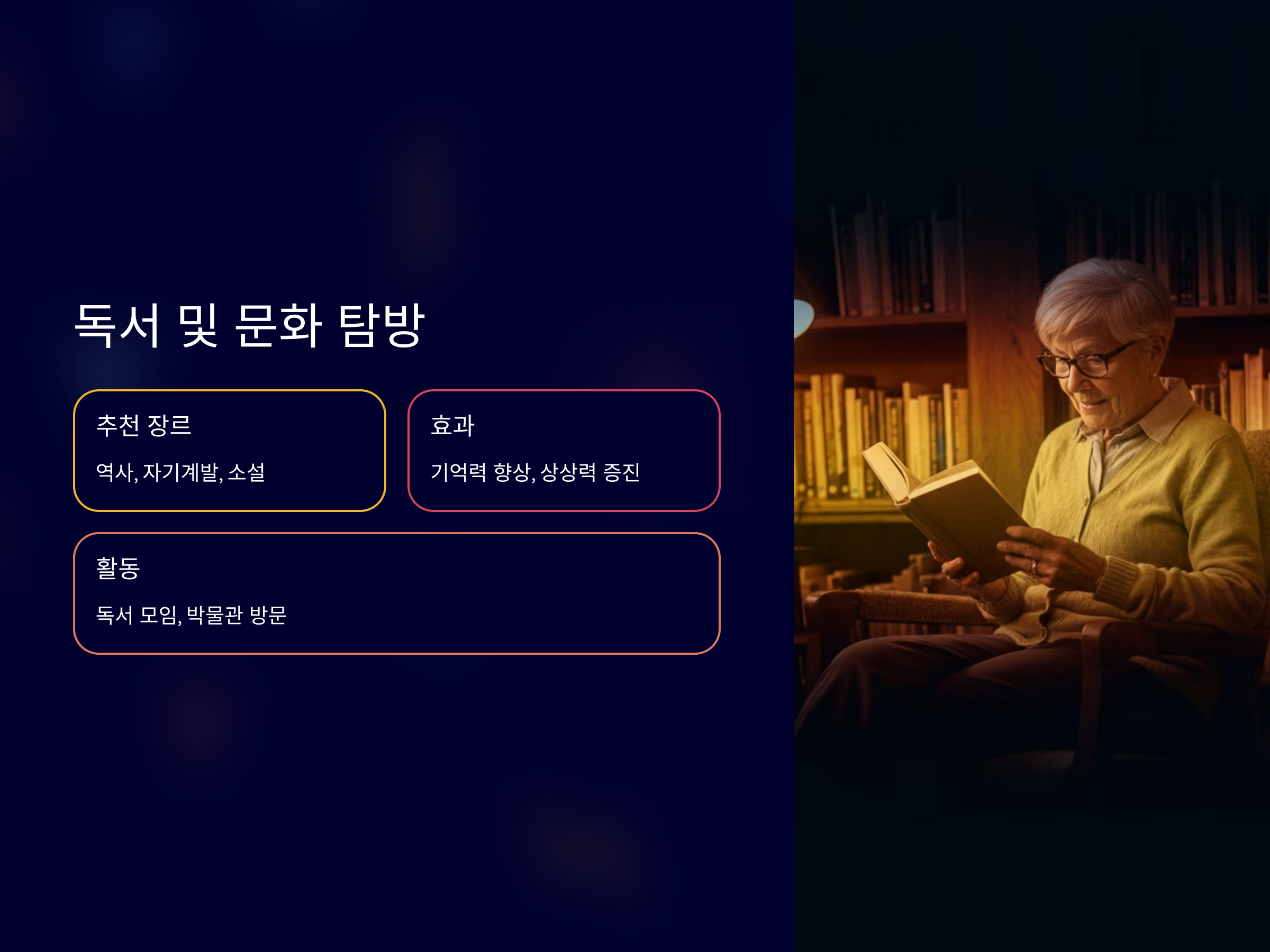 독서는 시니어들이 새로운 지식을 얻고 감성을 충전할 수 있는 시간입니다. 더불어 박물관이나 공연장을 방문하는 문화 탐방도 권장됩니다.