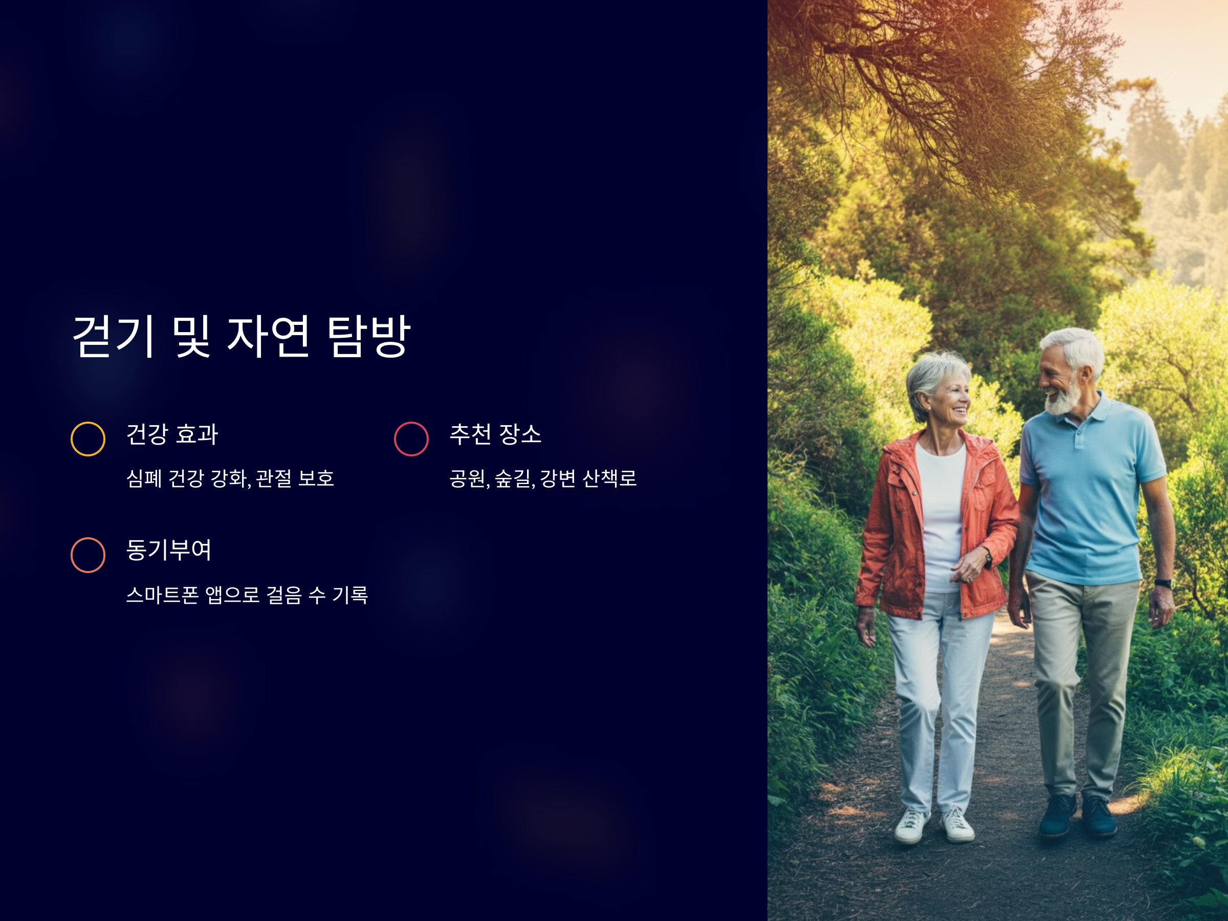 걷기는 시니어가 가장 쉽게 시작할 수 있는 여가활동입니다. 특히 자연 속에서 걷는 것은 단순한 운동을 넘어 심리적 안정과 힐링을 제공합니다.
