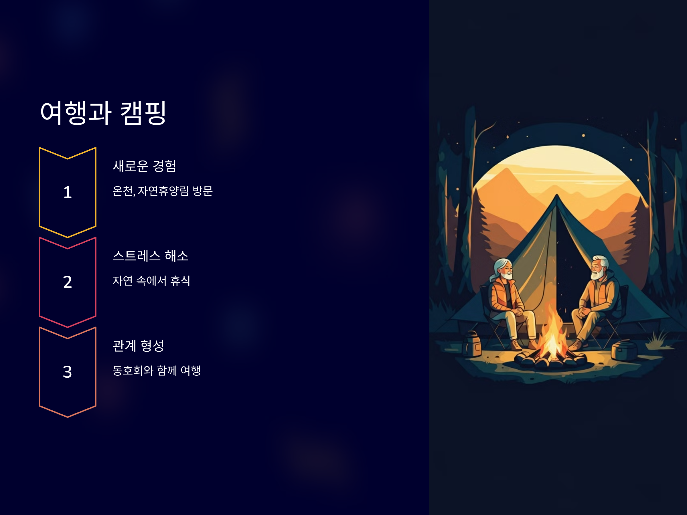 여행은 시니어들에게 새로운 환경과 문화를 접할 기회를 제공합니다. 캠핑은 비교적 저렴한 비용으로 자연을 만끽할 수 있는 방법입니다.
