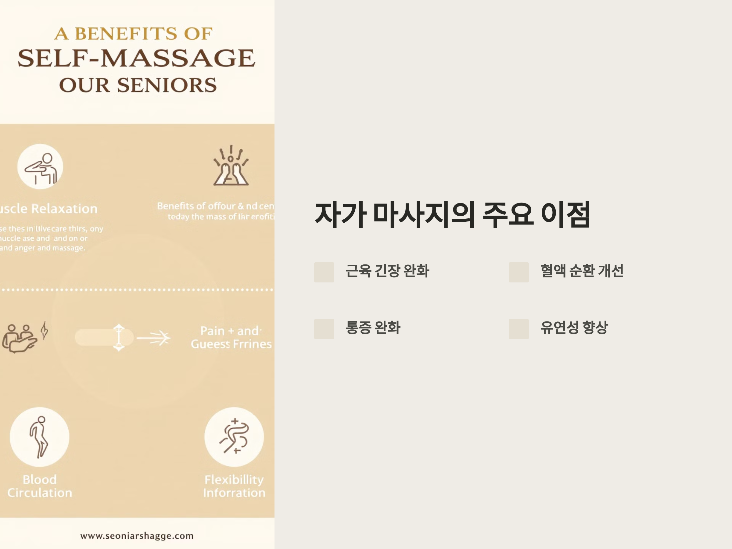 자가 마사지는 시니어의 신체적, 정신적 건강에 다양한 혜택을 제공합니다. 특히 몸을 직접 마사지하면서 얻을 수 있는 효과는 다음과 같습니다.