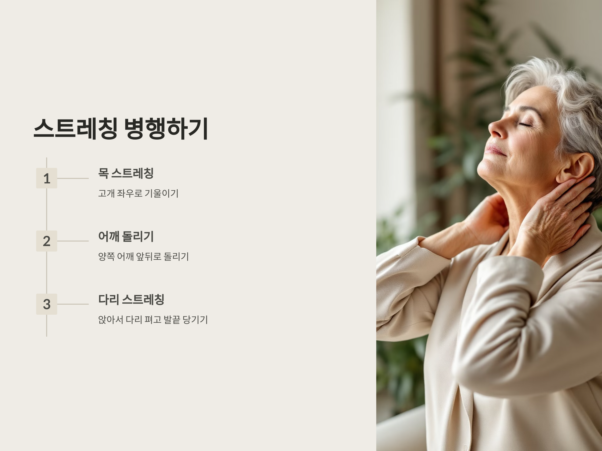 - 목 스트레칭: 고개를 천천히 좌우로 기울여 목 근육을 풀어줍니다.