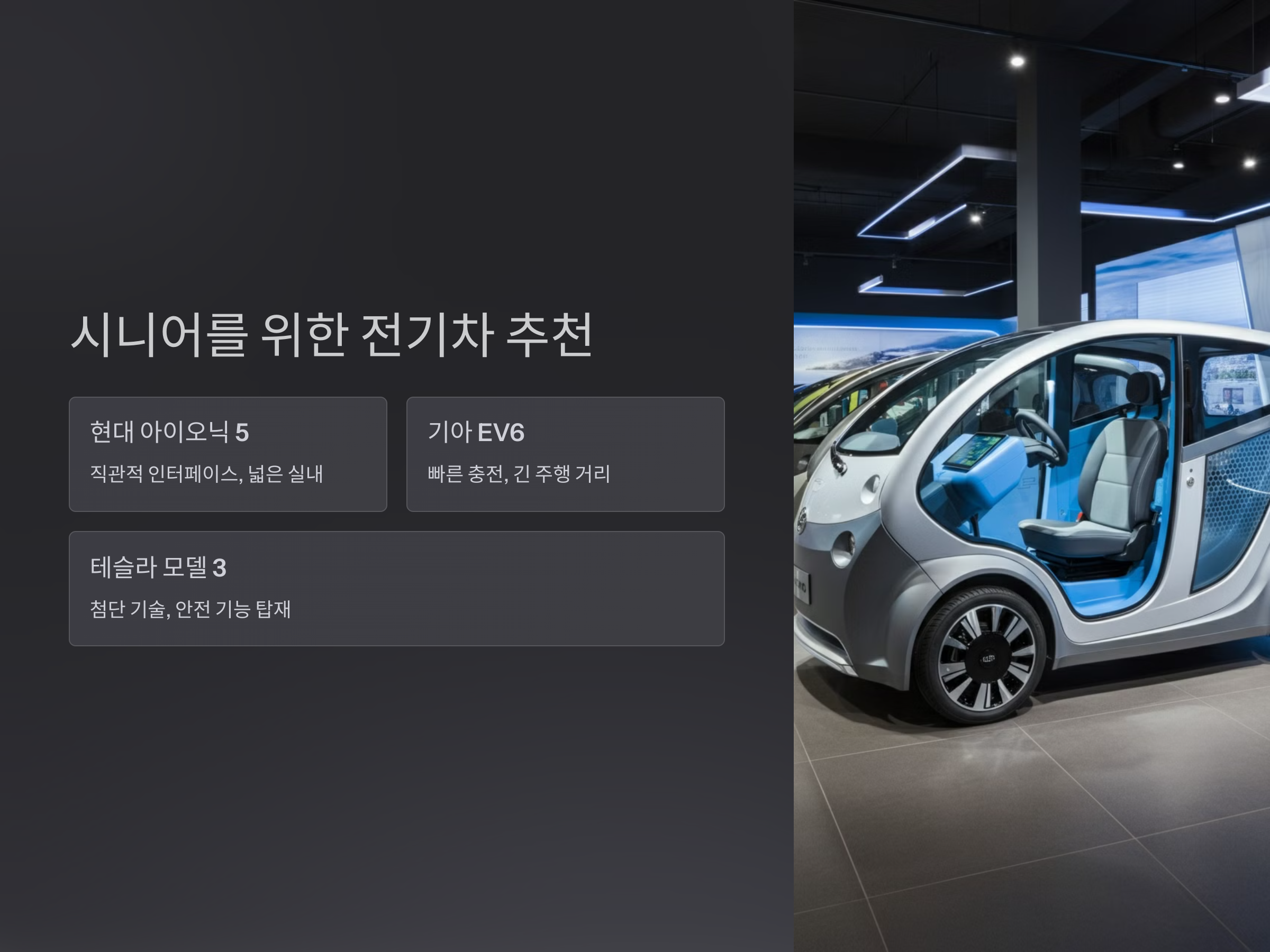 다양한 전기차 중에서 시니어에게 적합한 모델을 소개합니다.