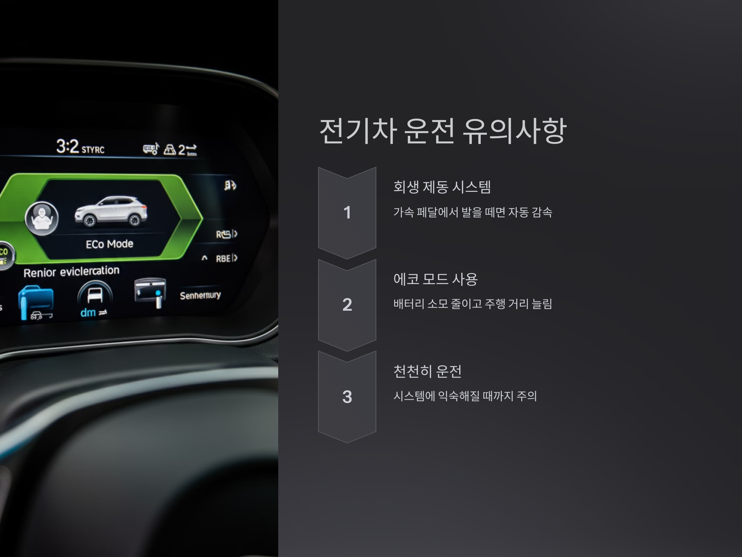 전기차는 기존 차량과 운전 방식이 약간 다를 수 있습니다. 아래의 유의사항을 참고하세요.
