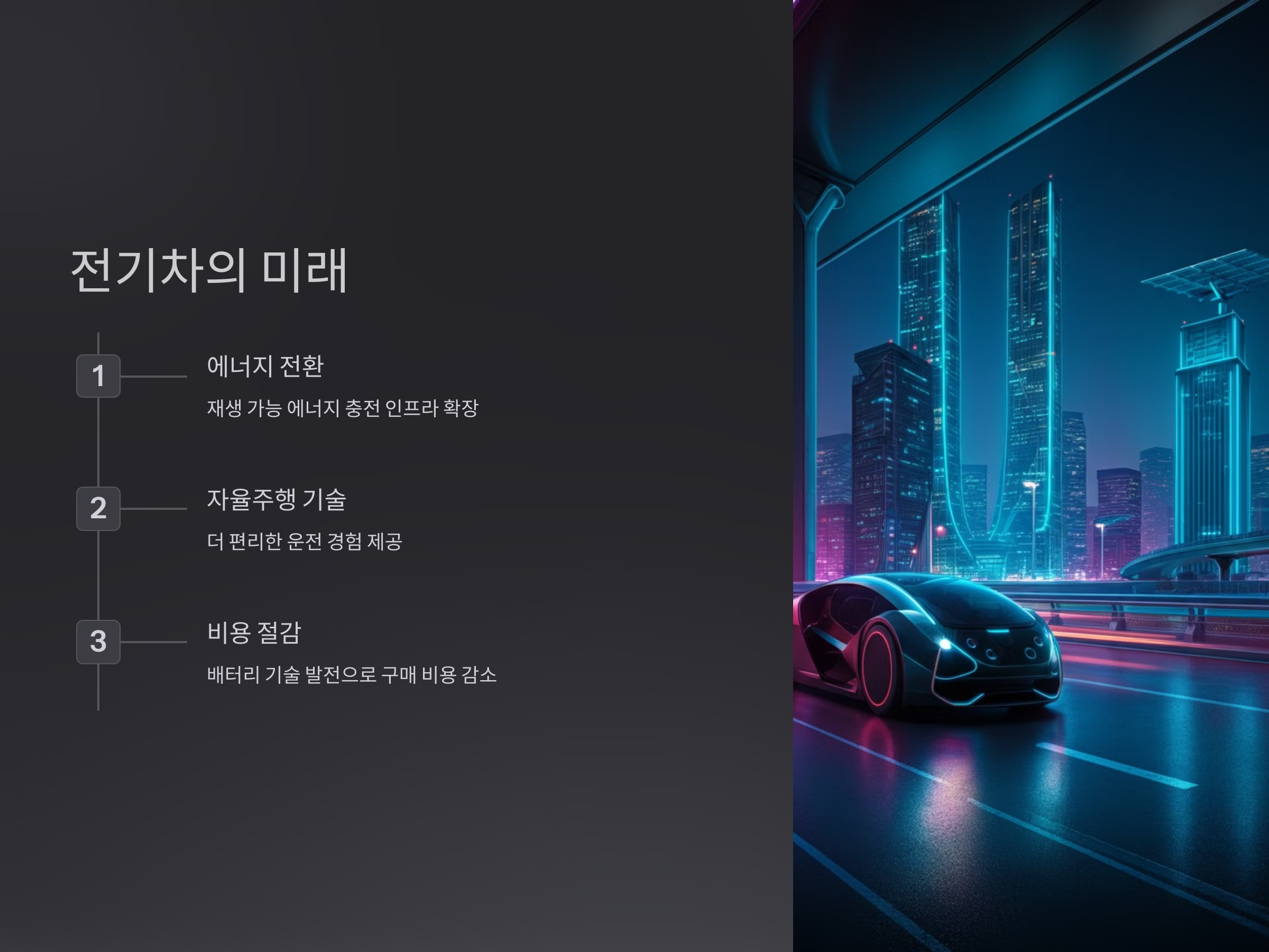 - 비용 절감: 배터리 기술이 발전하며 초기 구매 비용도 점차 낮아질 전망입니다.