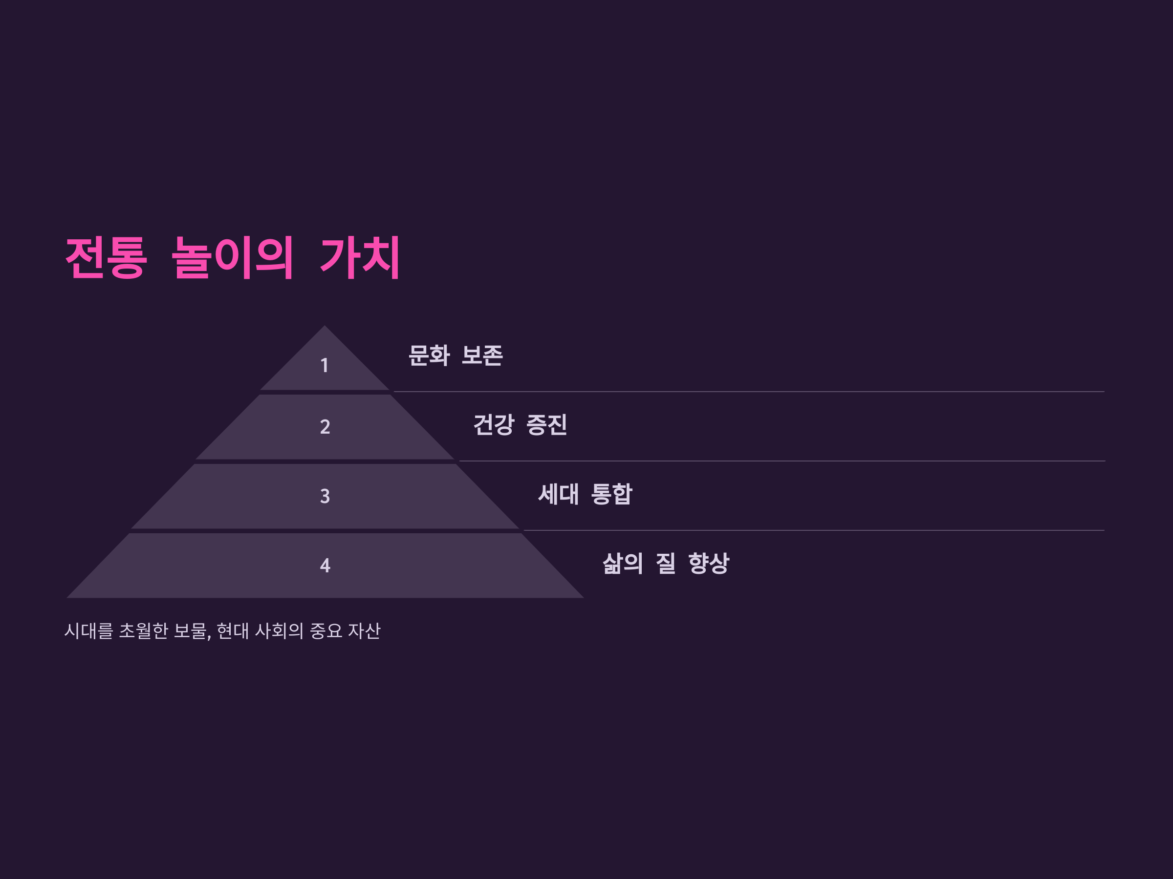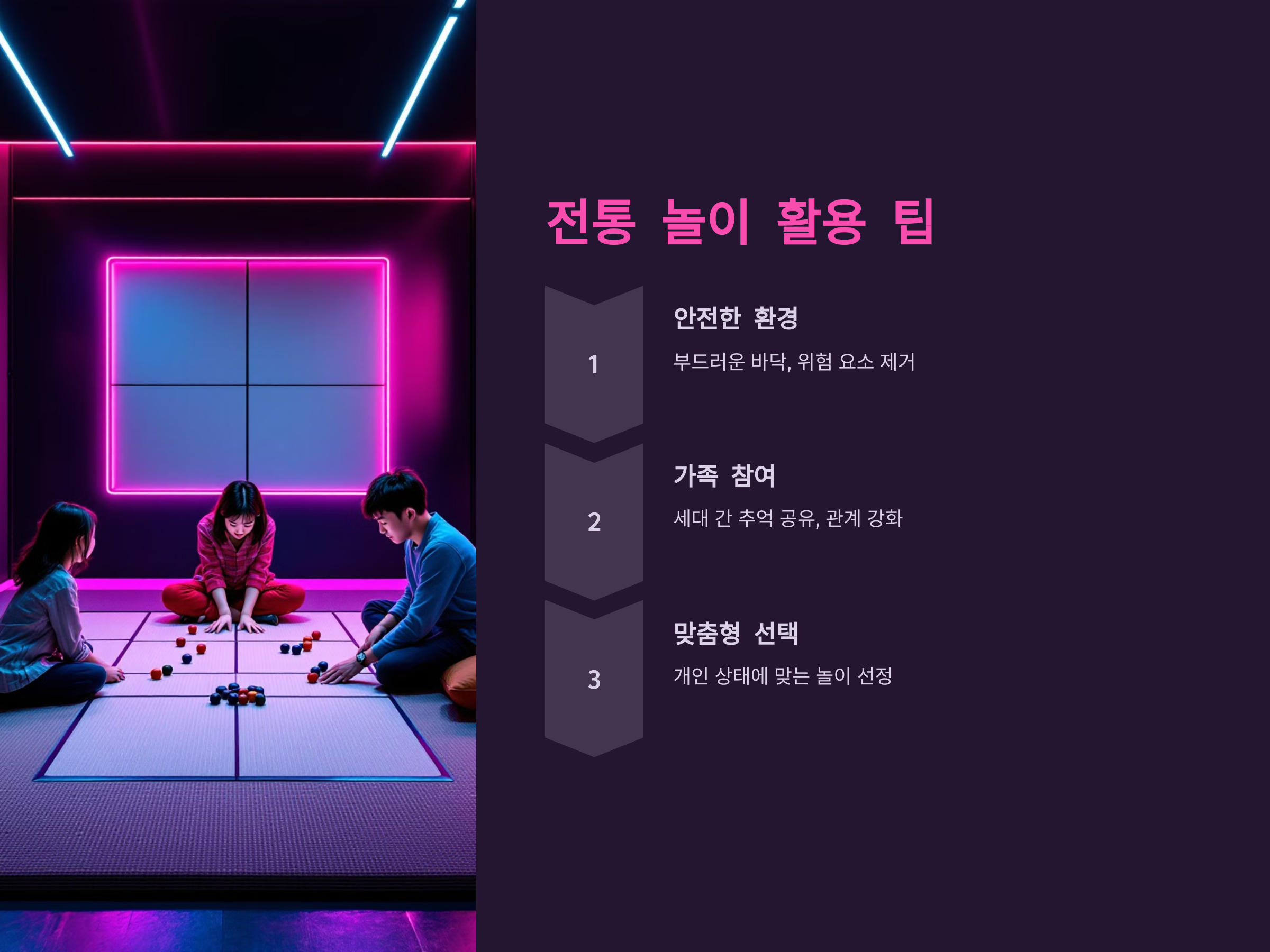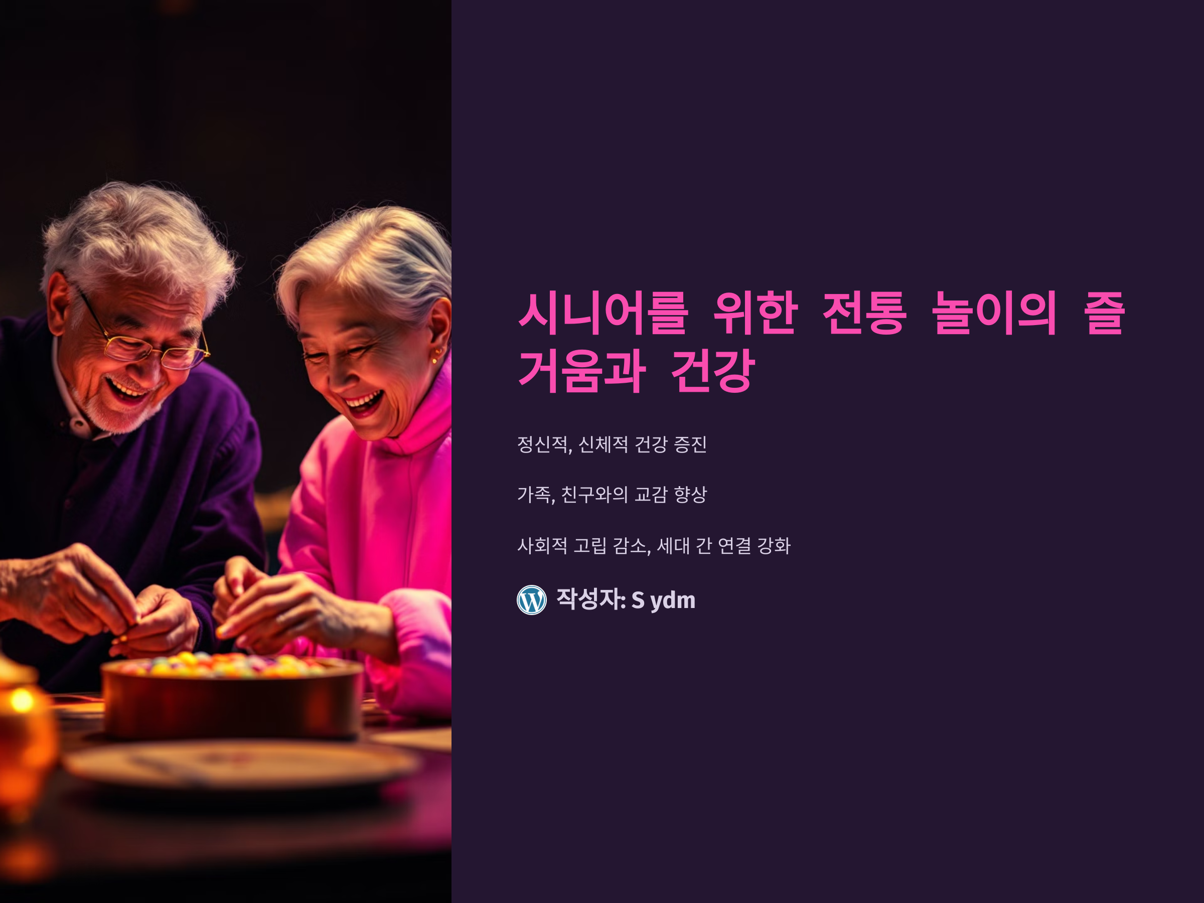 전통 놀이는 단순한 여가 활동을 넘어 시니어의 삶을 더욱 풍요롭게 만들어줍니다. 신체적 건강, 정서적 안정, 그리고 가족과의 유대를 강화하는 전통 놀이의 가치는 시대를 초월한 보물이자, 현대 사회에서 더욱 주목받아야 할 자산입니다.