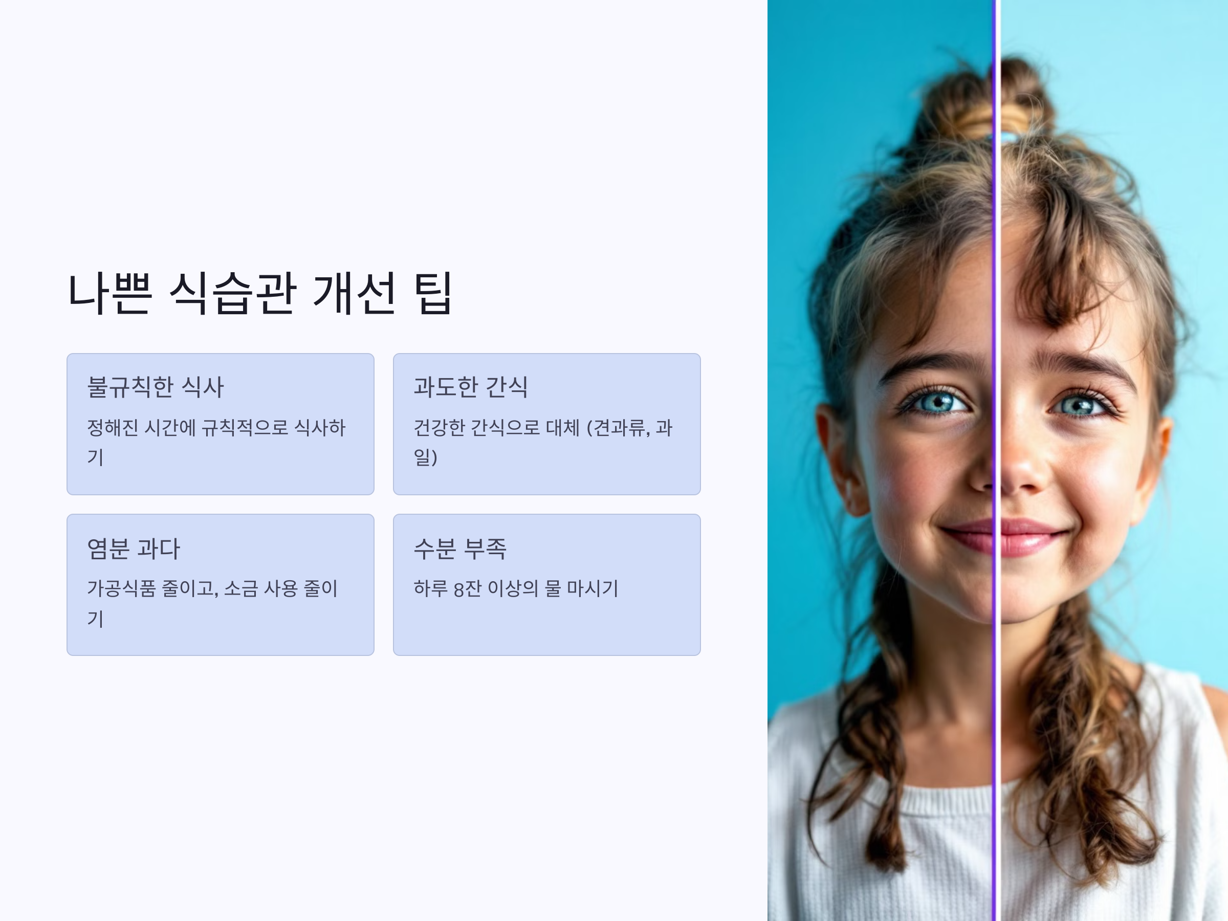 - 수분 섭취 부족: 하루 8잔 이상의 물을 마시도록 노력하세요.