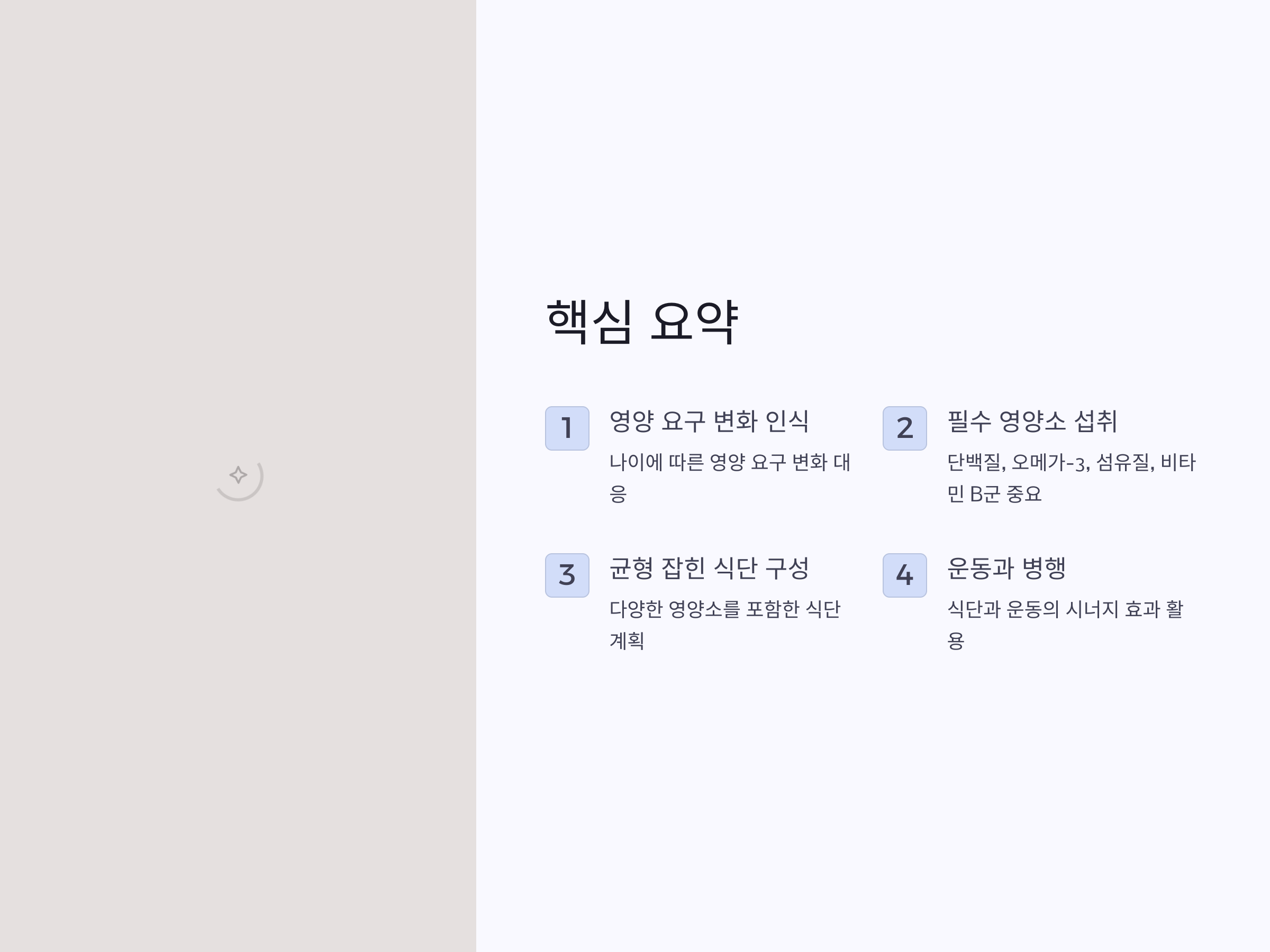 적절한 식단은 만성질환 예방과 노화 속도 완화에 도움을 주며, 신체 기능을 오랫동안 유지할 수 있도록 합니다.