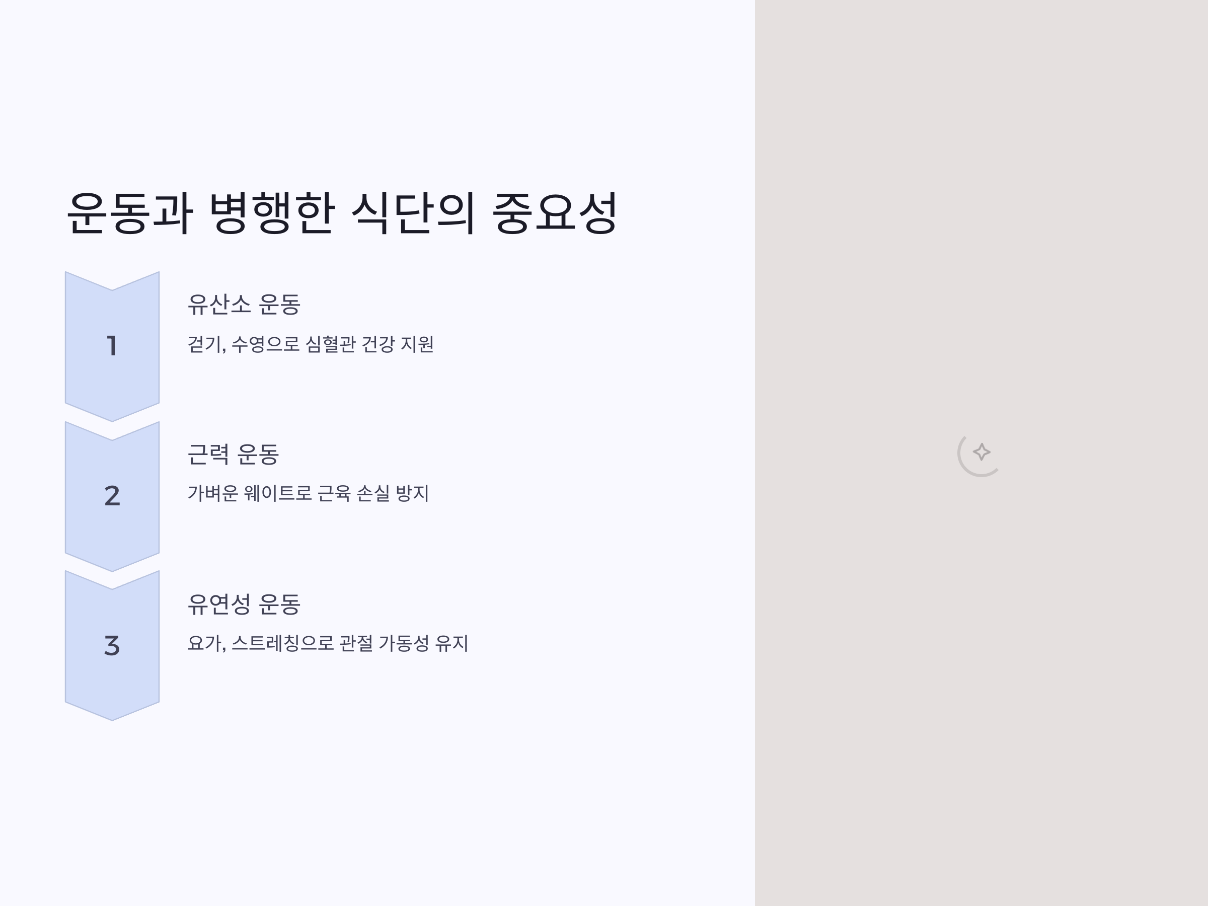 - 근력 운동: 가벼운 웨이트나 맨손 체조로 근육 손실을 방지합니다.