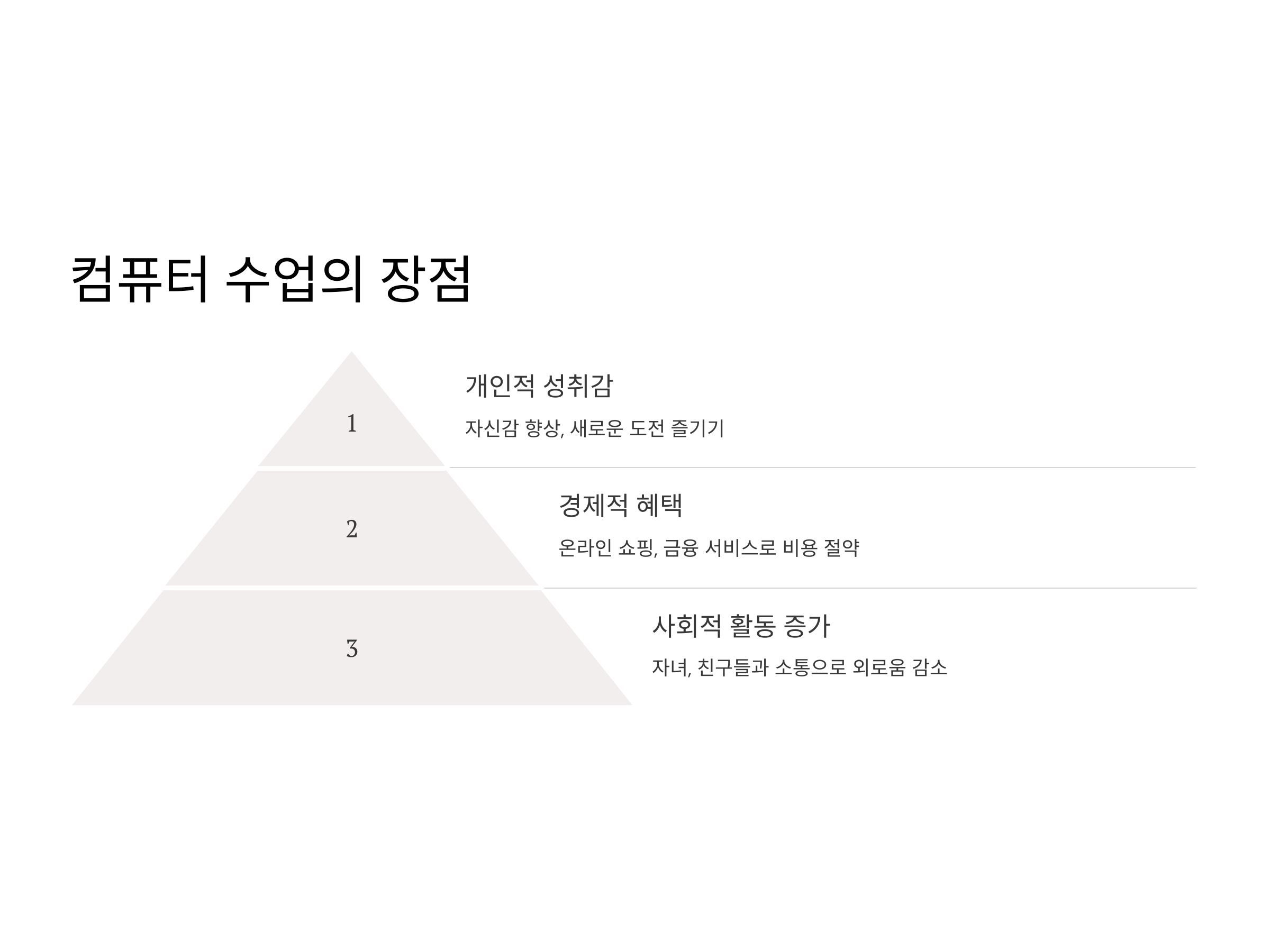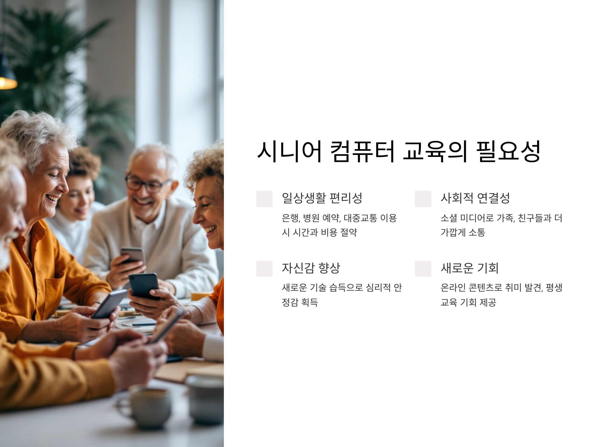 적절한 컴퓨터 수업은 시니어들의 디지털 소외를 해소하고, 기술 활용 능력을 높여줍니다.