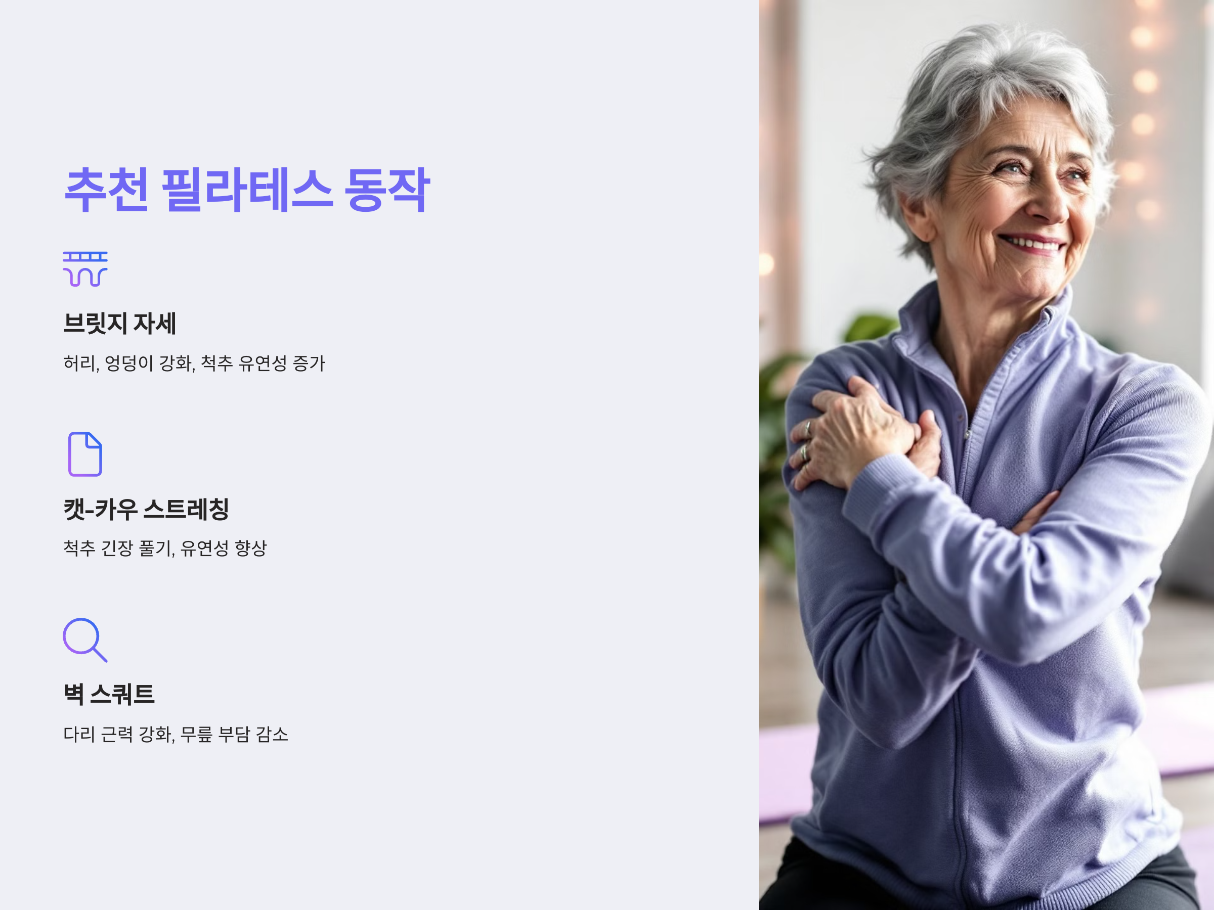 시니어들에게 적합한 필라테스 동작은 간단하면서도 효과적으로 몸의 균형과 힘을 기를 수 있는 것들입니다. 여기 몇 가지 동작을 소개합니다.
