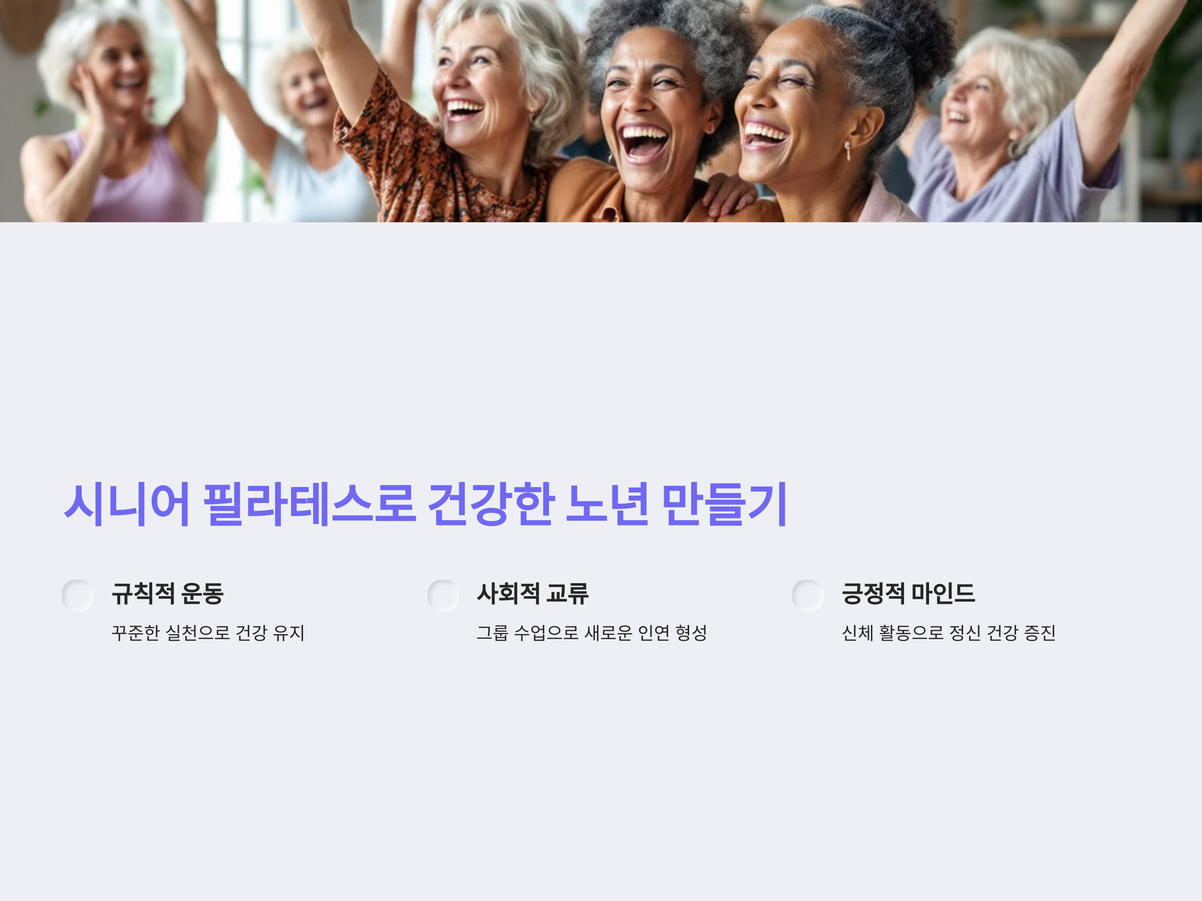 필라테스를 꾸준히 하면 건강한 신체뿐만 아니라 정신적으로도 안정감을 얻을 수 있습니다. 삶의 활력을 되찾고 보다 행복한 노년을 보내고 싶다면, 필라테스는 최고의 선택이 될 것입니다.