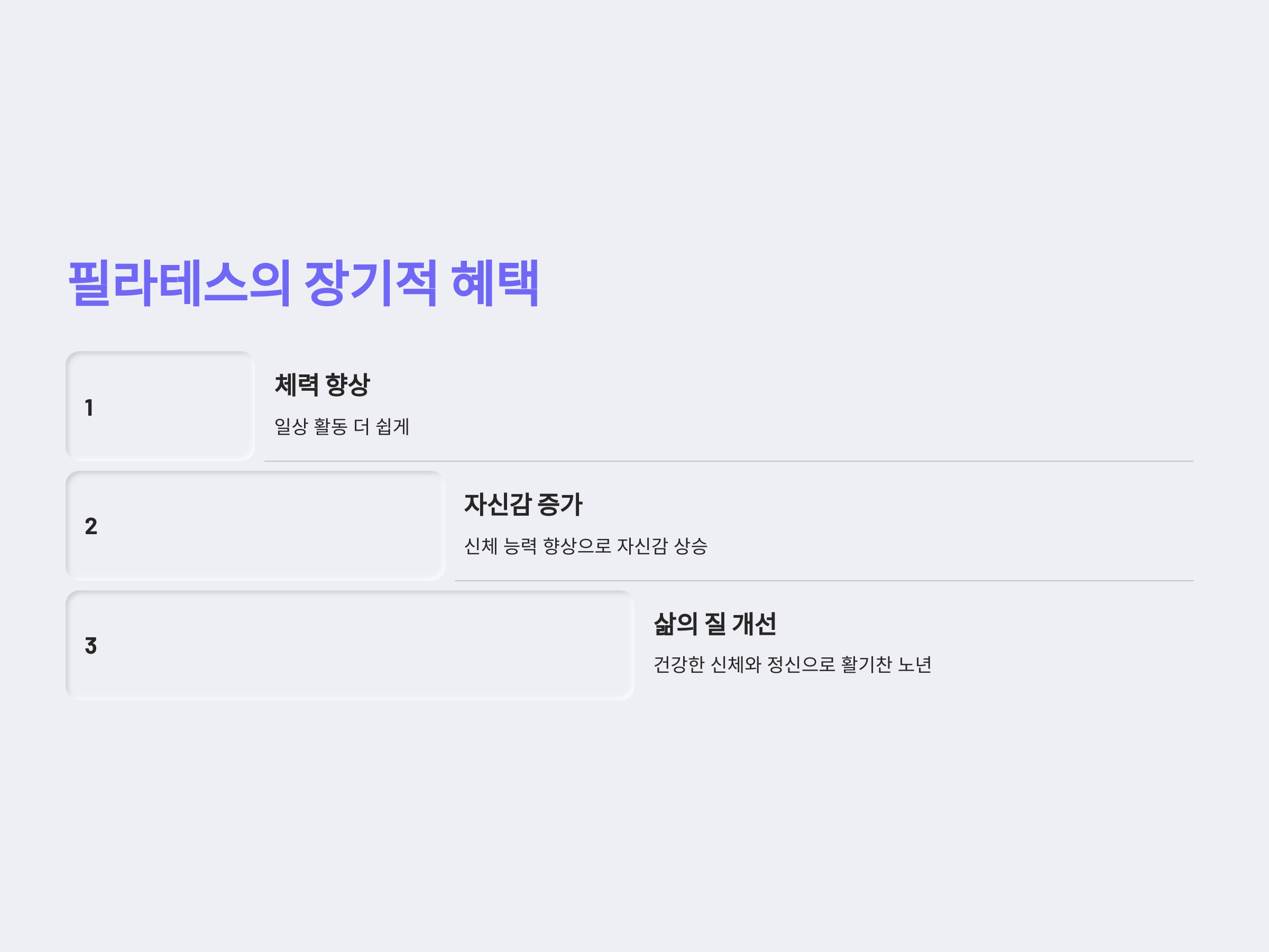 시니어를 위한 필라테스는 단순히 체력을 증진시키는 것을 넘어 전반적인 삶의 질 향상에 기여합니다. 필라테스가 어떻게 시니어들에게 특별한 혜택을 제공하는지 구체적으로 살펴보겠습니다.