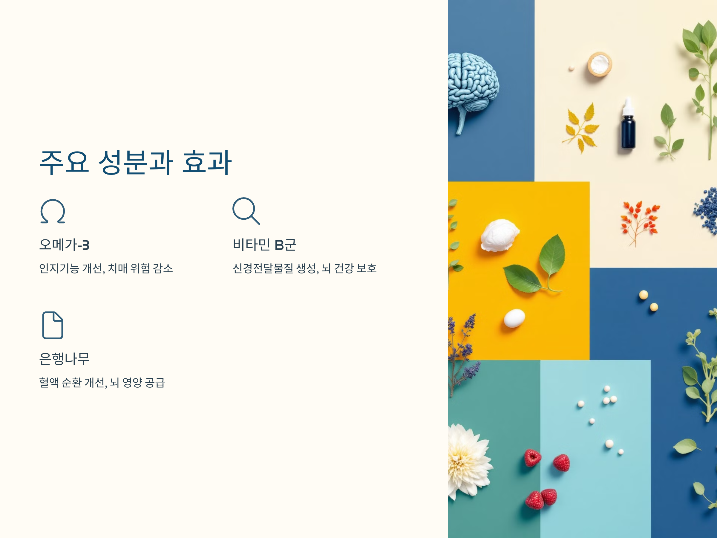 미국 국립보건원(NIH)의 연구에 따르면, 이러한 성분을 포함한 보조제는 뇌 건강 유지와 관련된 긍정적인 결과를 보였습니다. 다만, 장기적이고 일관된 사용이 중요합니다.