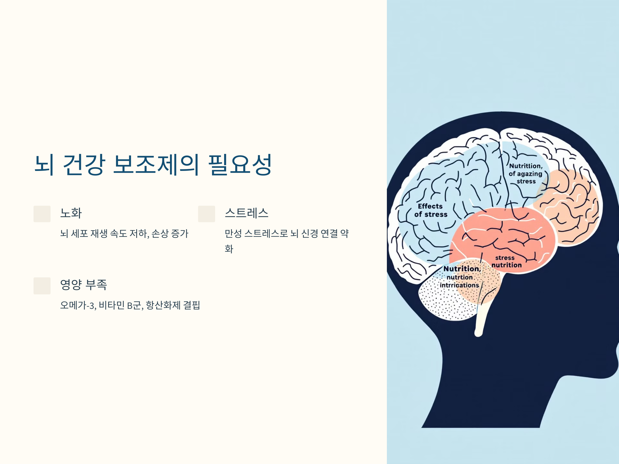 - 노화: 나이가 들수록 뇌 세포 재생 속도가 느려지고 손상이 증가합니다.