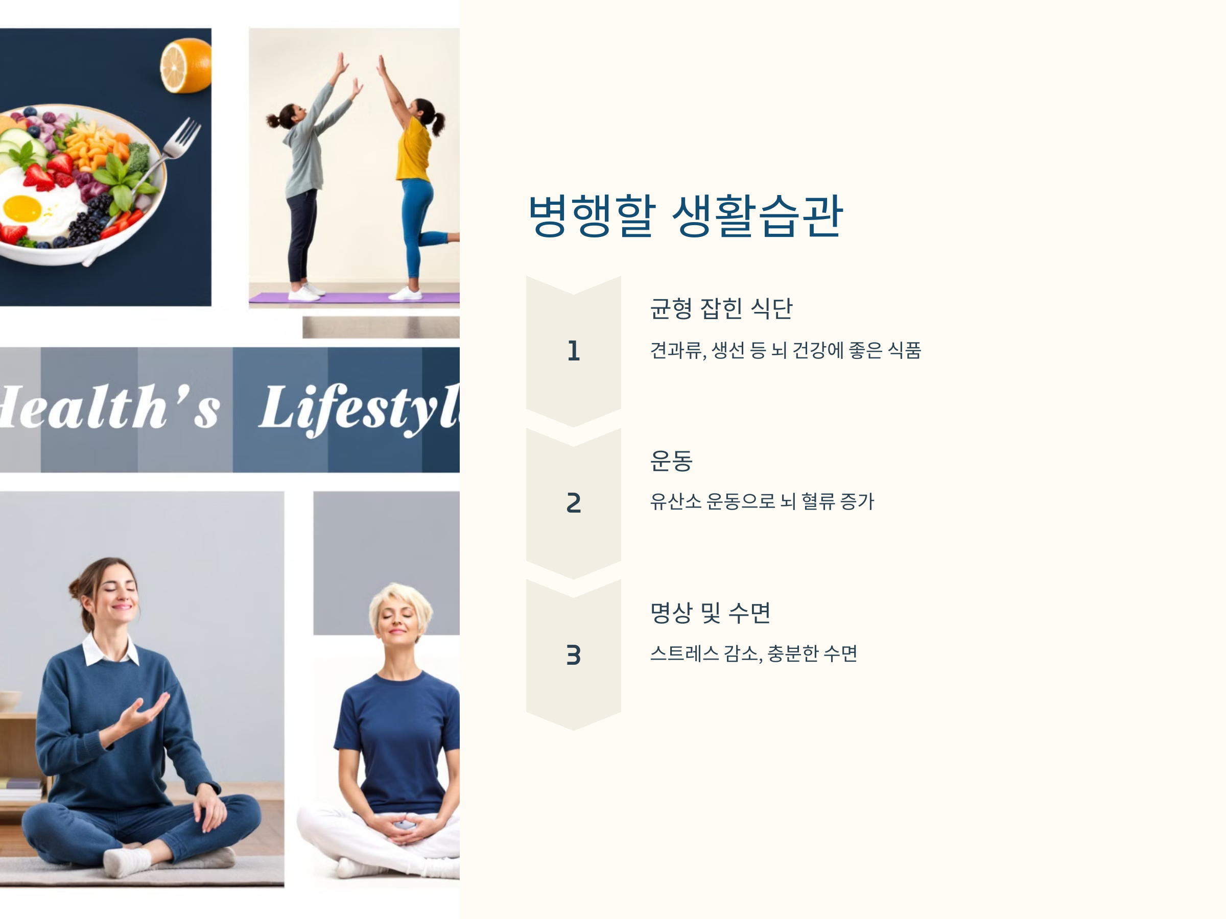 - 균형 잡힌 식단: 뇌 건강에 유익한 식품 섭취(견과류, 생선 등).
