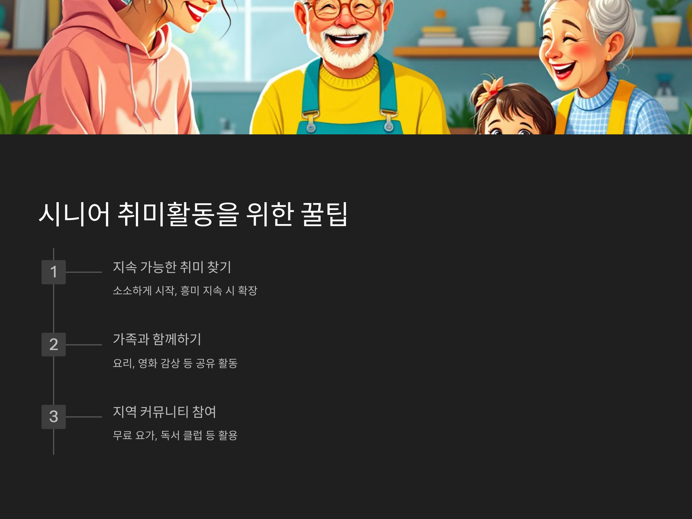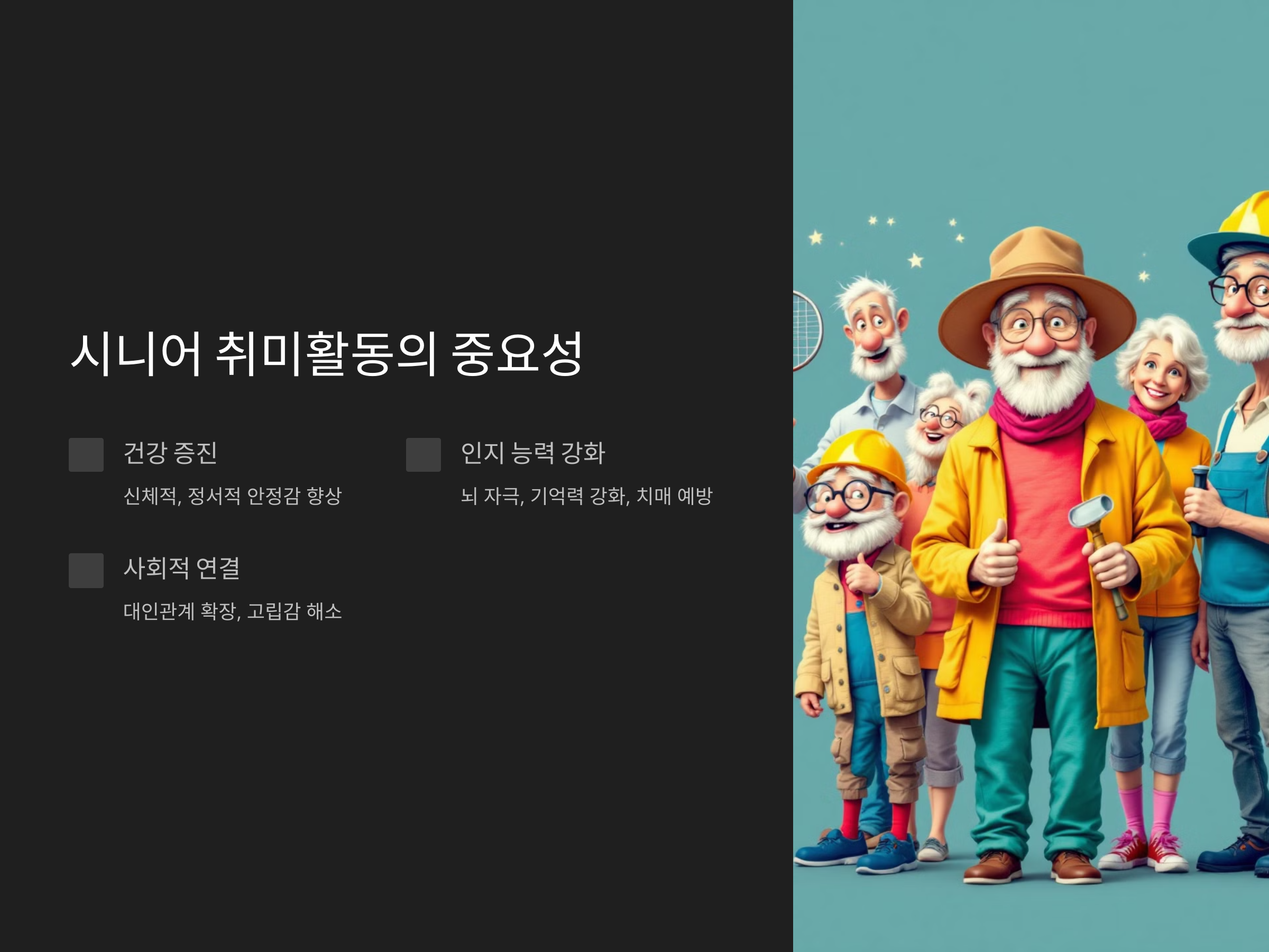 시니어의 취미활동은 단순히 시간을 보내는 것을 넘어 전반적인 삶의 질을 크게 개선합니다. 신체적 건강은 물론 정서적 안정감까지 도와주기 때문에 적극적으로 참여하는 것이 중요합니다.