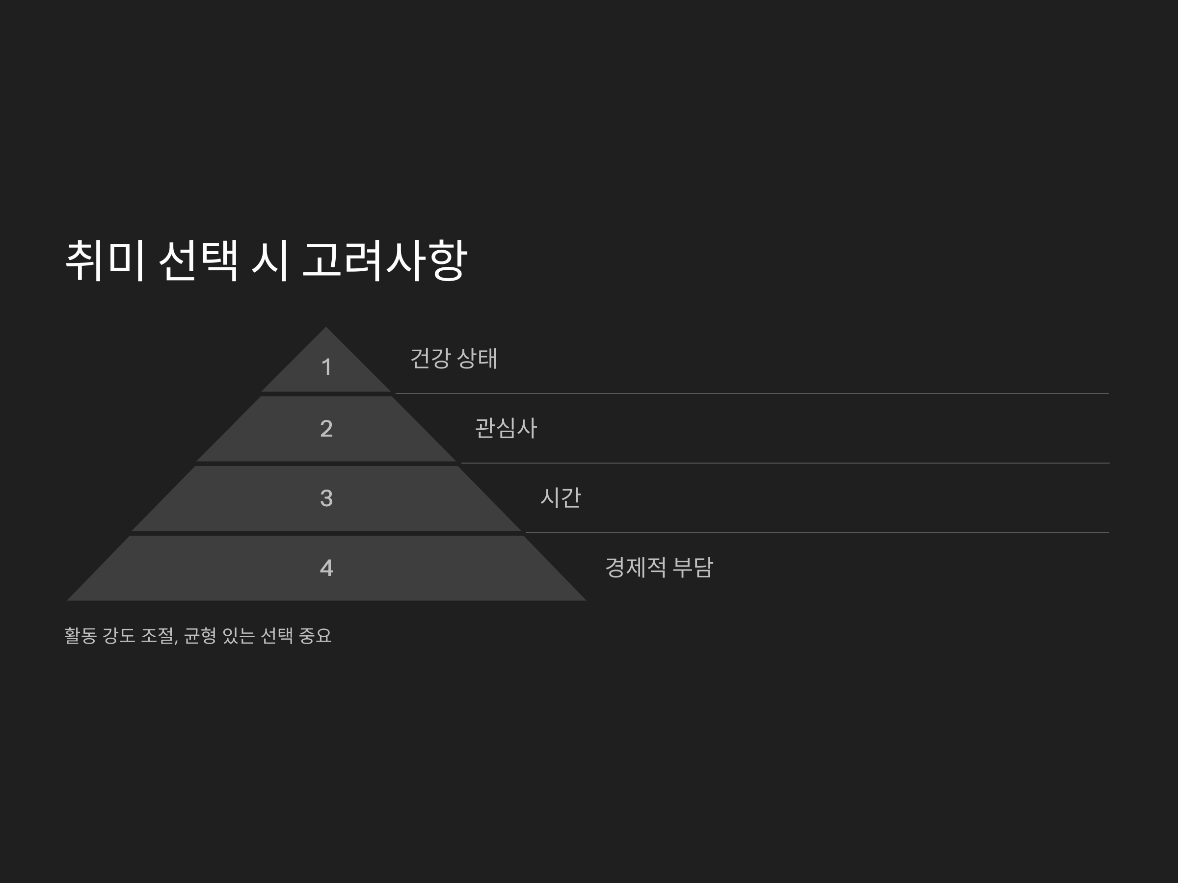 취미를 선택할 때는 자신의 건강 상태, 관심사, 시간 등을 고려해야 합니다. 무리한 활동은 오히려 부상을 초래할 수 있으니 주의가 필요합니다.
