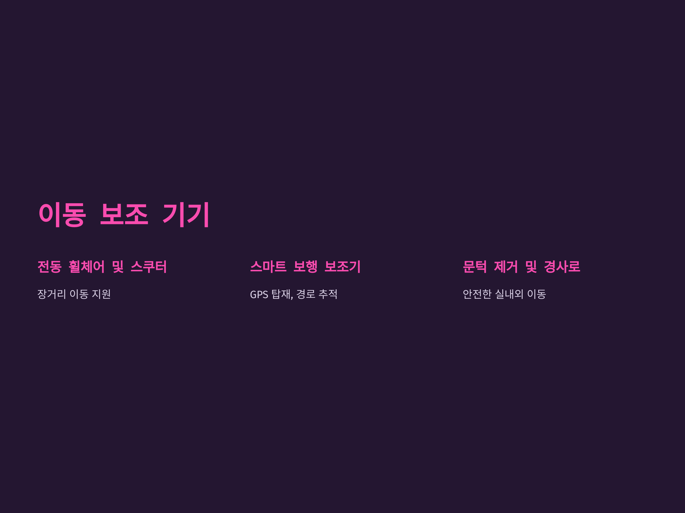 전동 이동 기기는 장거리 이동 시 힘들지 않게 도와주며, 교외 활동에도 큰 도움을 줍니다.