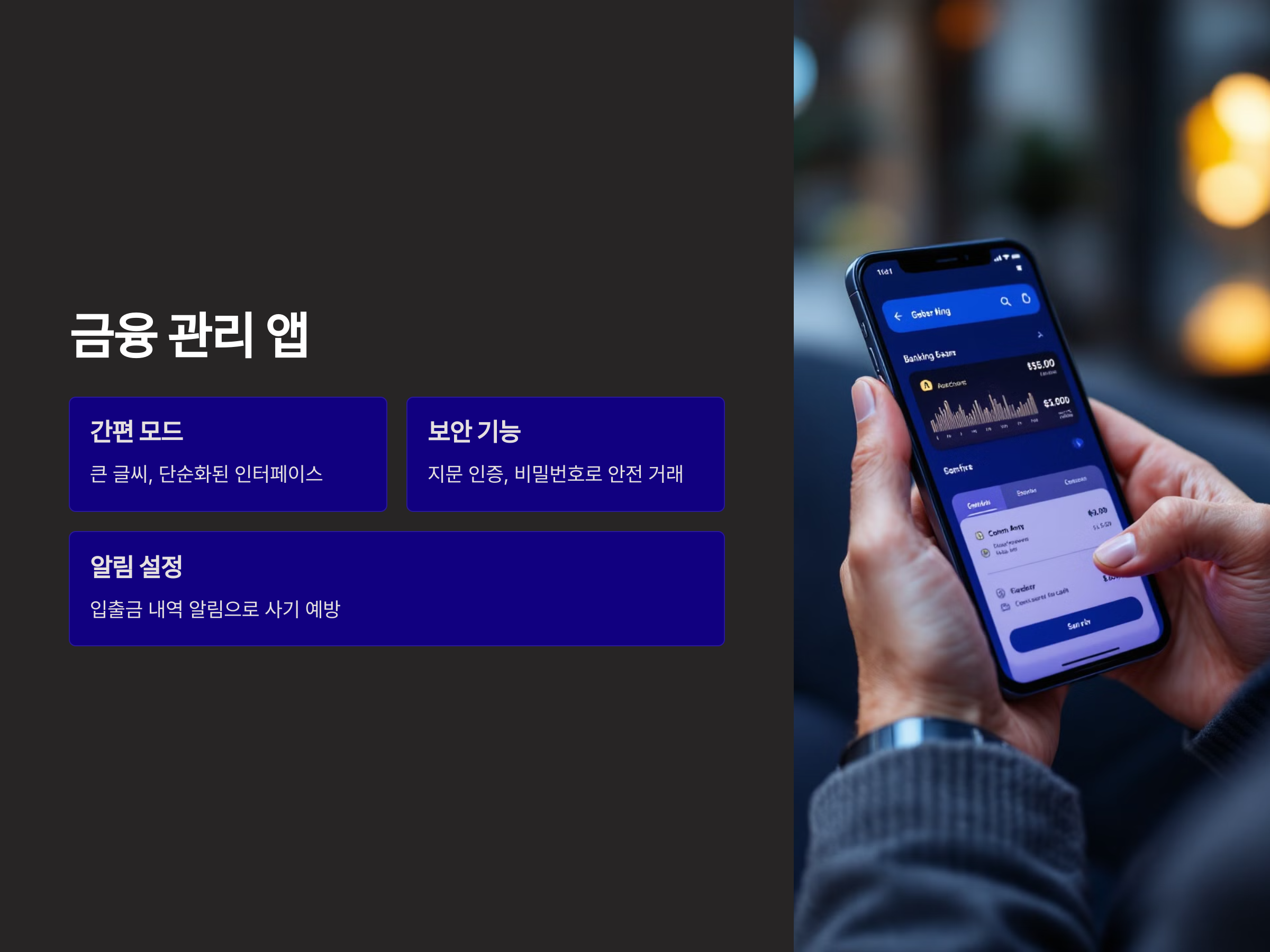 '카카오뱅크'와 같은 금융 앱은 은행을 방문하지 않아도 예금, 송금, 이체 등의 기능을 제공합니다. 특히 시니어들을 위한 '큰 글씨 모드'와 '간단 모드'를 제공해 사용이 더욱 편리합니다.