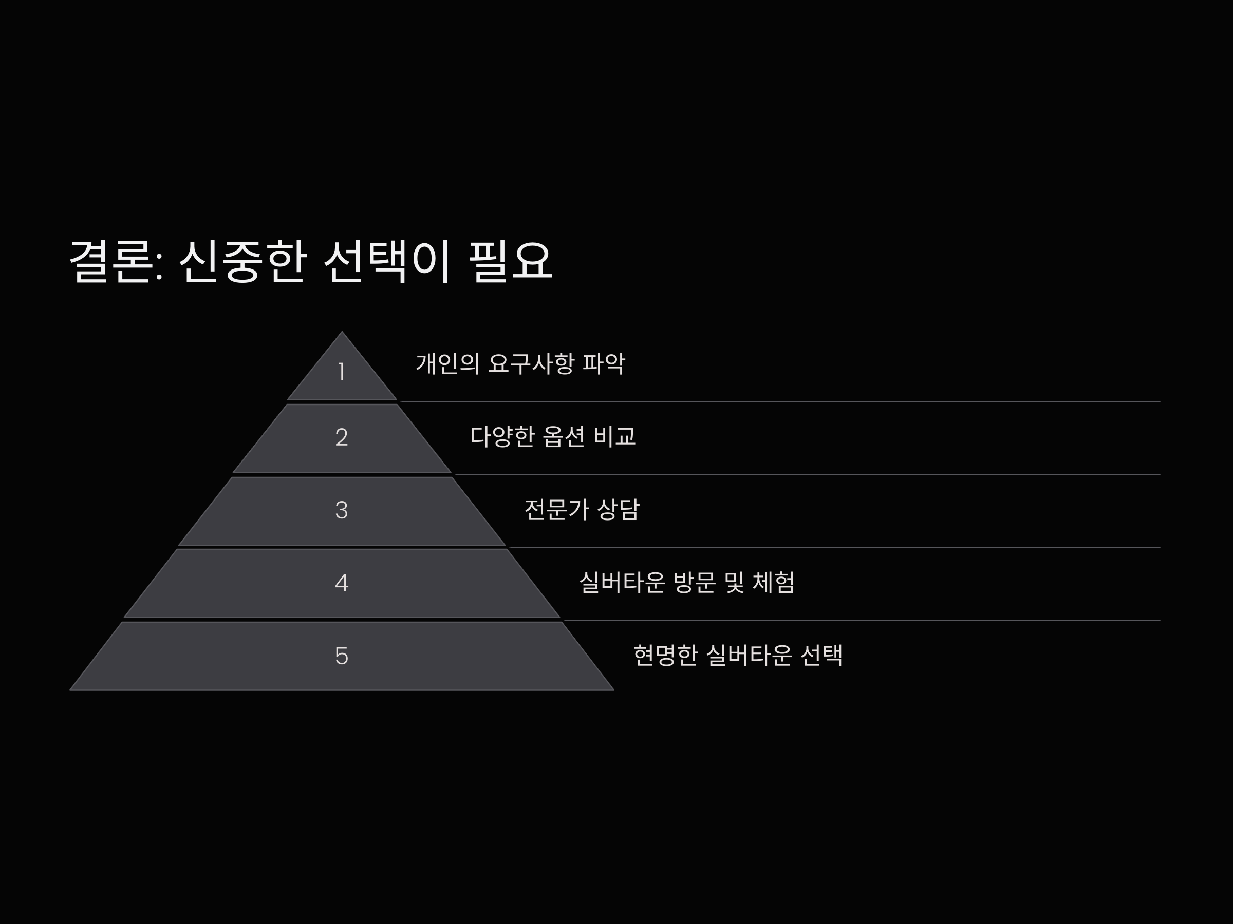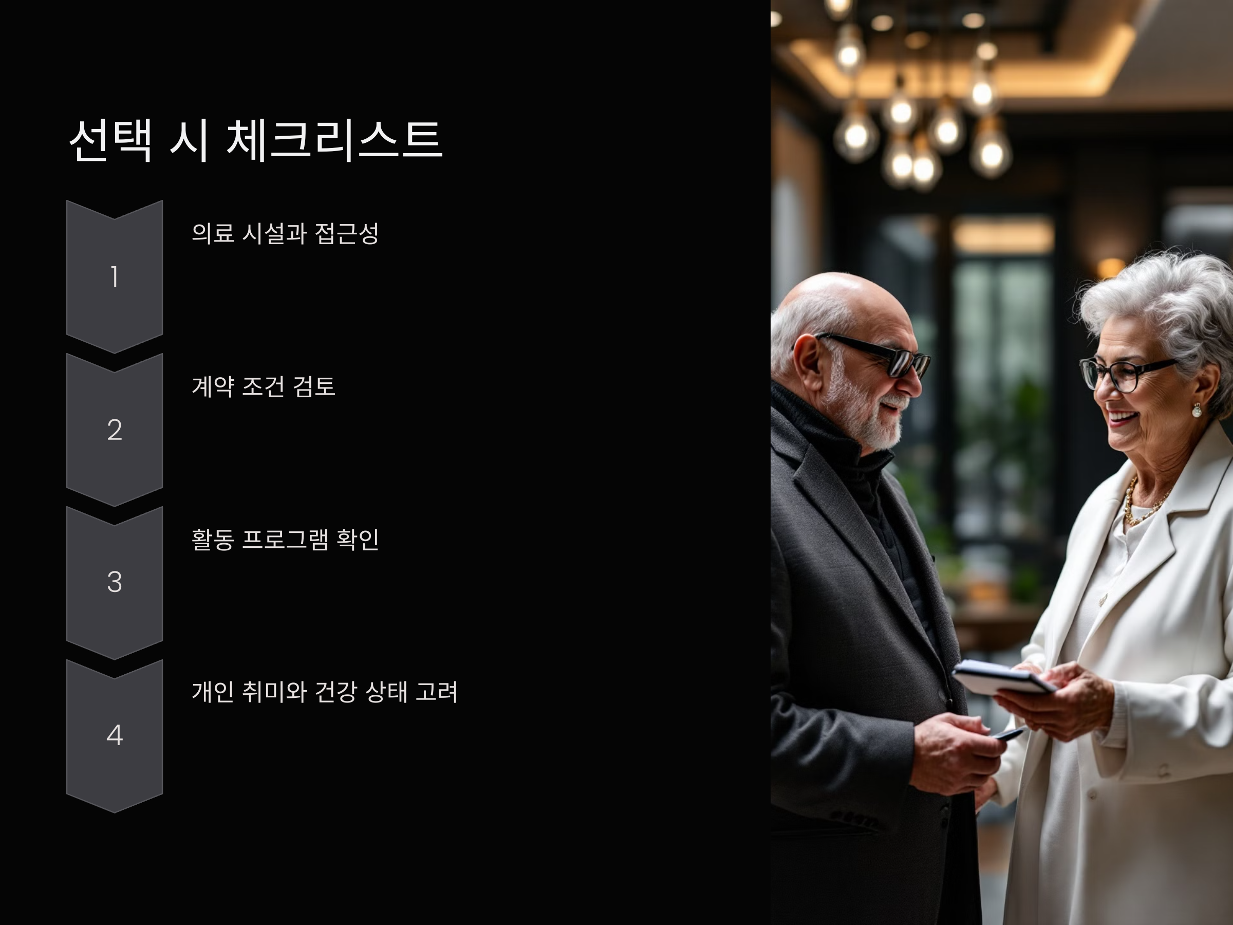 실버타운 선택 시 가장 중요한 요소는 입지, 비용, 그리고 제공 서비스입니다. 이 세 가지 요소가 입주자의 만족도를 좌우합니다. 각 요소를 상세히 살펴보겠습니다.