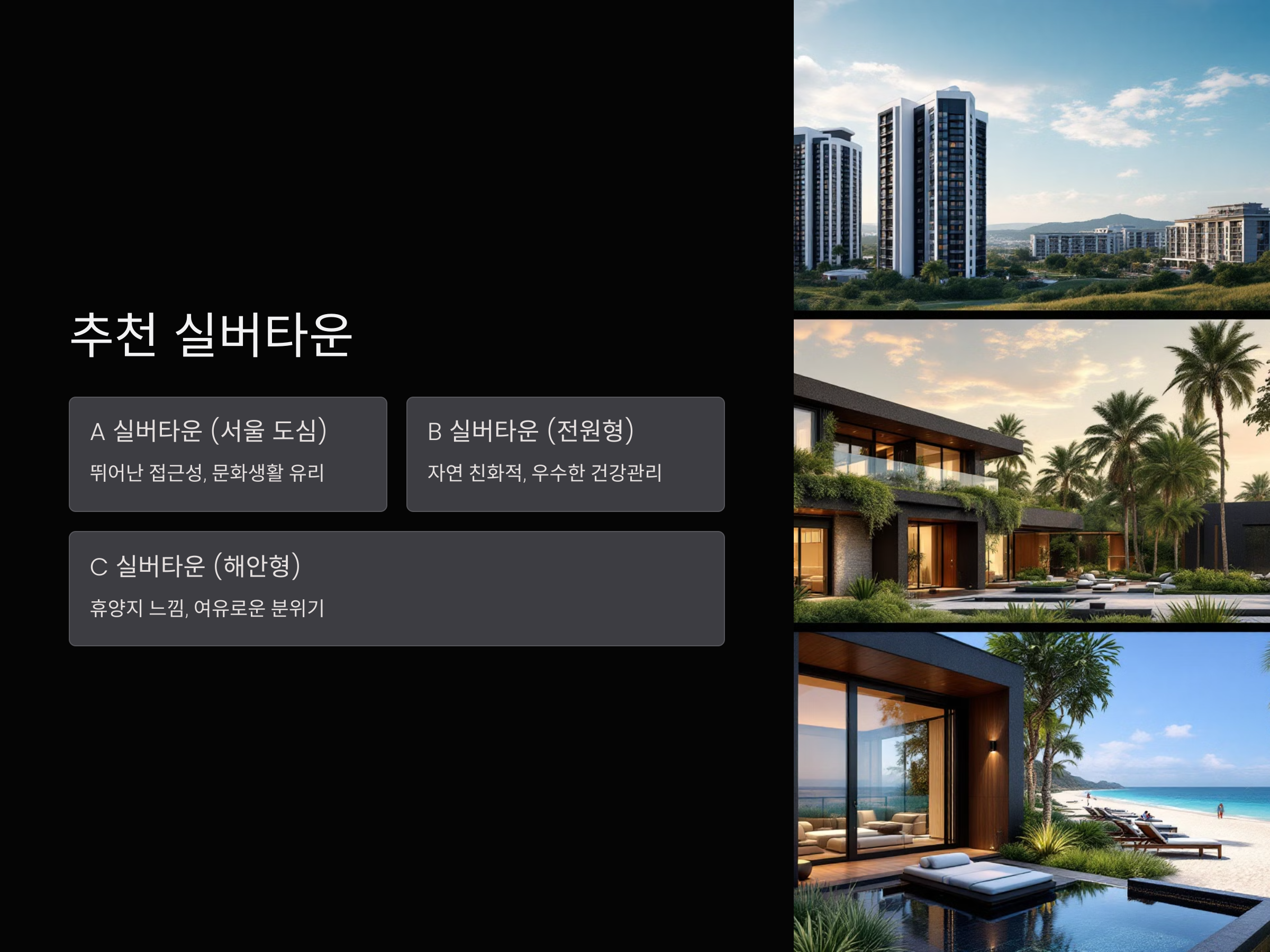 - 해안형 C 실버타운: 휴양지 느낌과 여유로운 분위기 제공