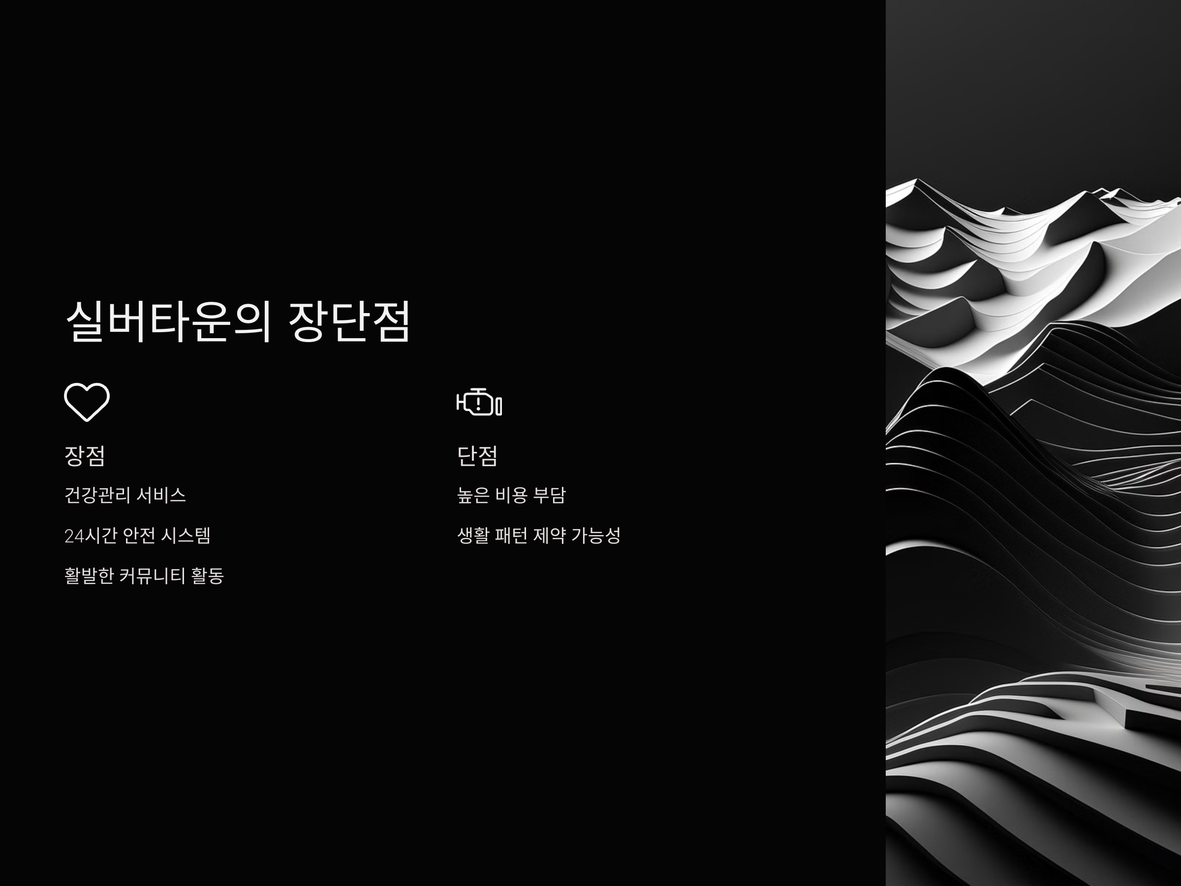 - 전원형 실버타운: 자연친화적이고 조용한 환경 제공