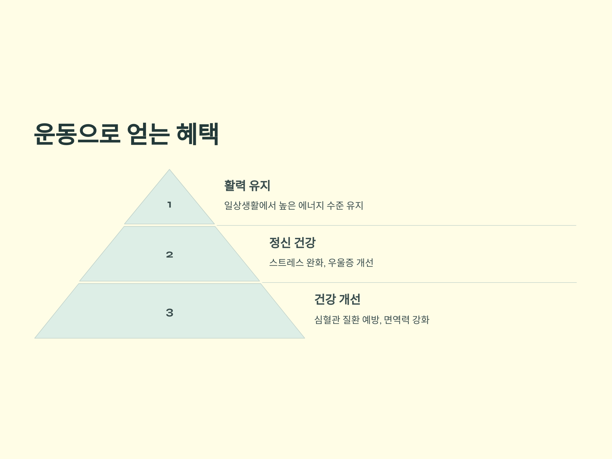 - 주 3~4회 이상 규칙적으로 운동하는 습관을 들이는 것이 중요합니다.