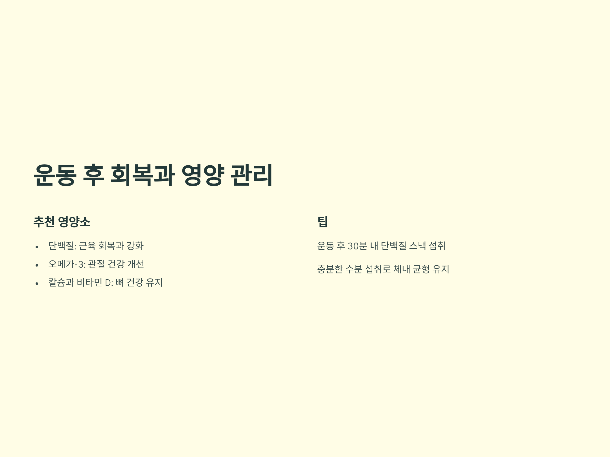 - 운동 후 30분 이내에 가벼운 단백질 스낵을 섭취하세요.