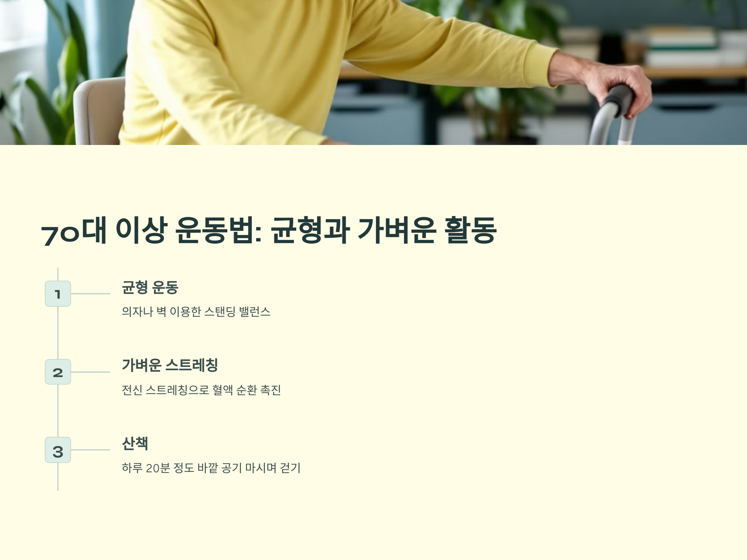 70대 이상에서는 넘어지지 않도록 균형 감각을 기르고, 일상 활동에 도움이 되는 운동을 중점적으로 해야 합니다. 안전을 최우선으로 두고, 신체의 움직임을 유지하는 데 초점을 맞춥니다.