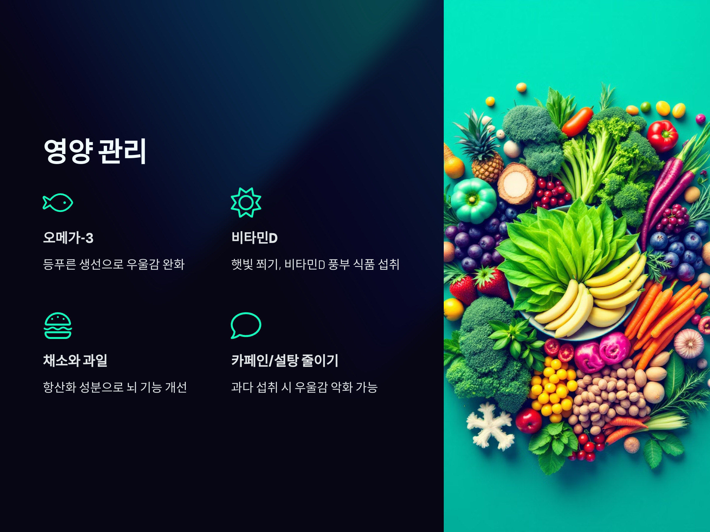 - 오메가-3 섭취: 연어, 고등어와 같은 등푸른 생선은 우울감을 완화시킵니다.