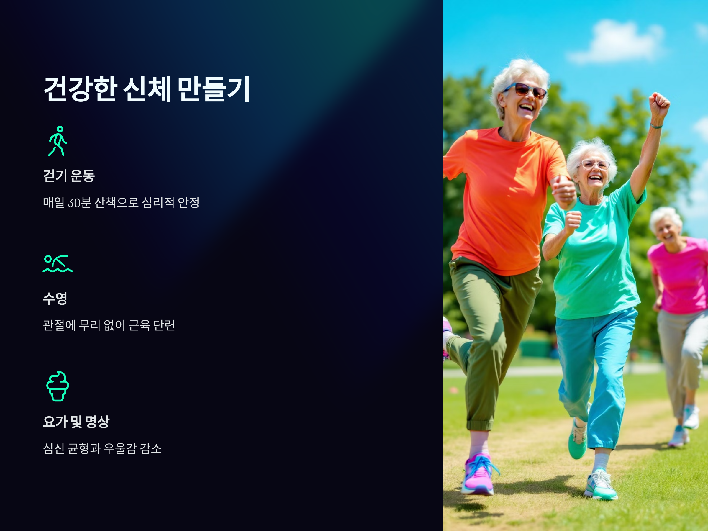 - 걷기 운동: 매일 30분 정도의 산책은 심리적 안정과 신체 건강에 큰 도움을 줍니다.