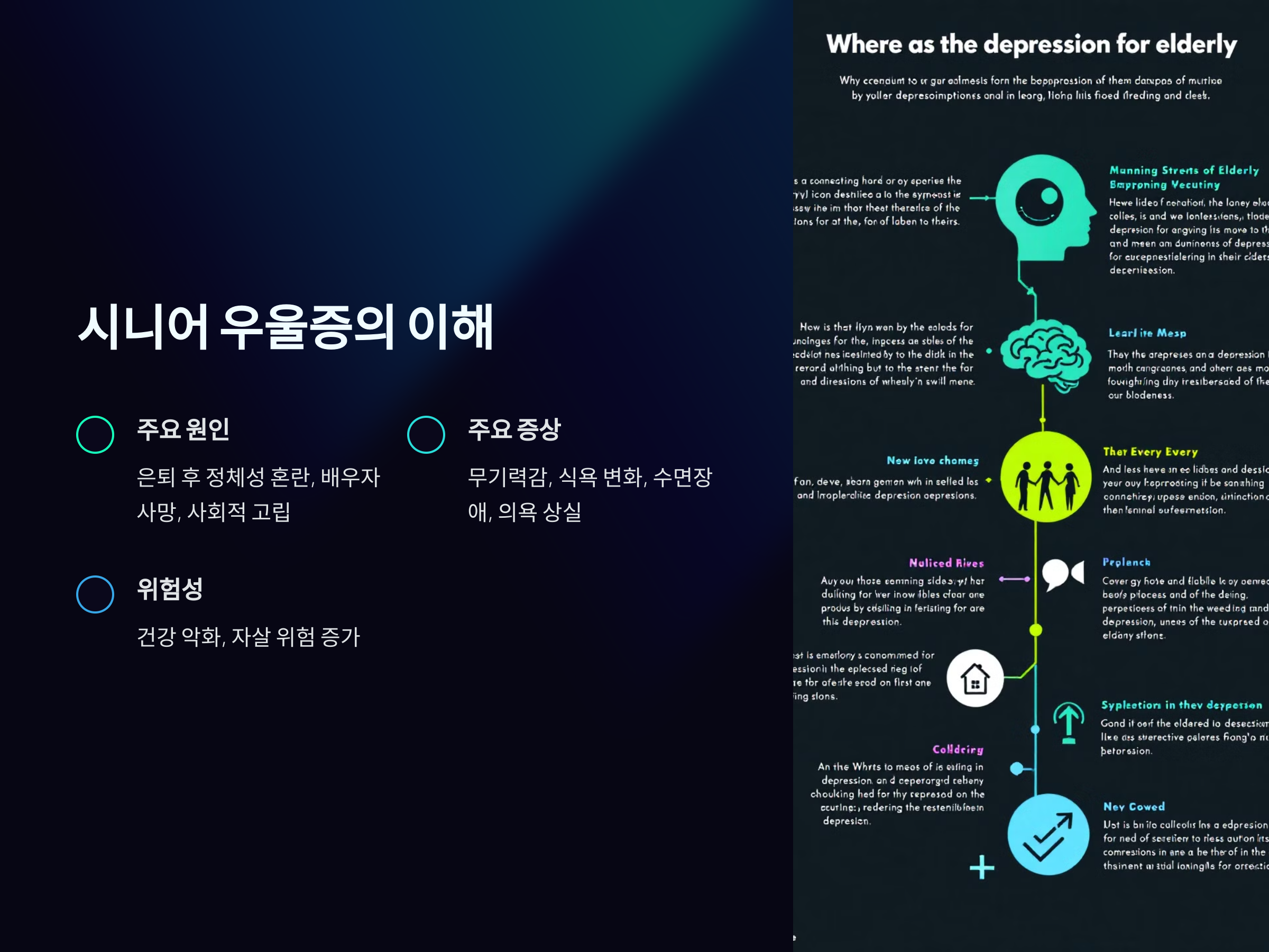 시니어 우울증은 노년층에서 발생하는 심리적 질환으로, 단순히 기분이 저조한 상태를 넘어 일상생활에 심각한 영향을 끼칩니다. 주요 원인으로는 은퇴 후 정체성 혼란, 배우자의 사망, 사회적 고립, 만성 질병 등이 있으며 이는 신체적, 정신적으로 복합적으로 작용합니다.