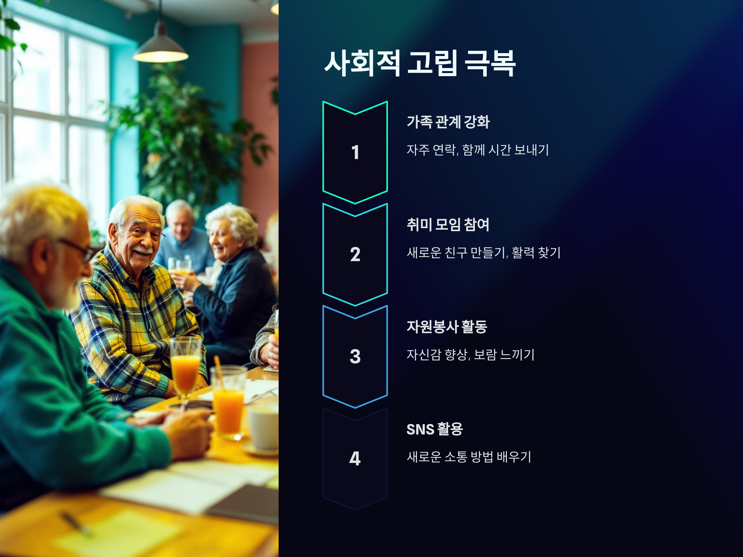 시니어 우울증의 중요한 원인 중 하나는 ‘사회적 고립’입니다. 친구, 가족과의 교류 부족은 정신 건강에 부정적인 영향을 미칠 수 있습니다. 이를 극복하기 위해 다음과 같은 노력이 필요합니다: