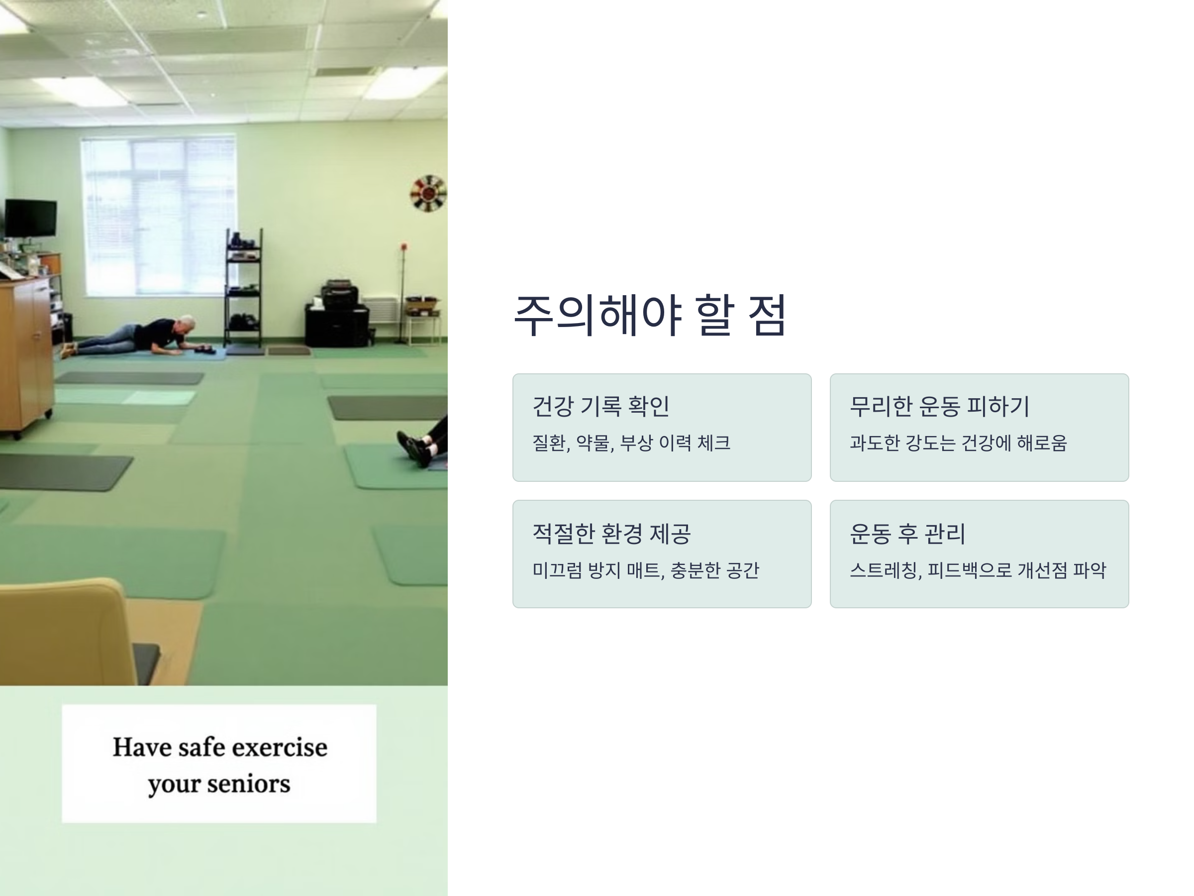 - 안전성 우선: 낙상을 방지하기 위해 운동 도구와 환경을 꼼꼼히 점검합니다.
