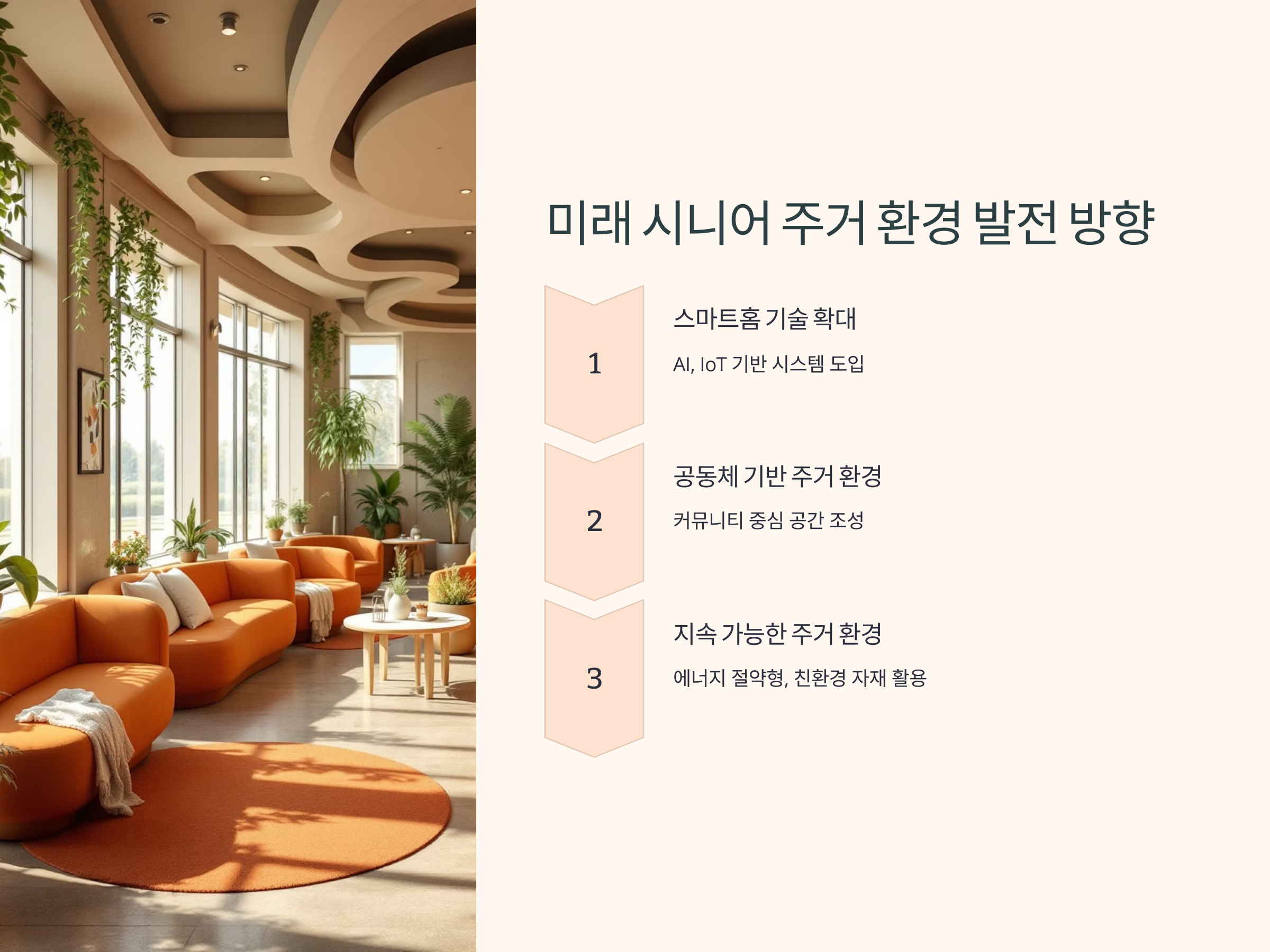 시니어 주거 환경 개선은 단순한 시설 변경을 넘어 스마트한 기술 도입과 커뮤니티 기반의 환경 개선이 결합되어야 합니다. 특히 미래에는 다음과 같은 방향으로 발전이 예상됩니다.