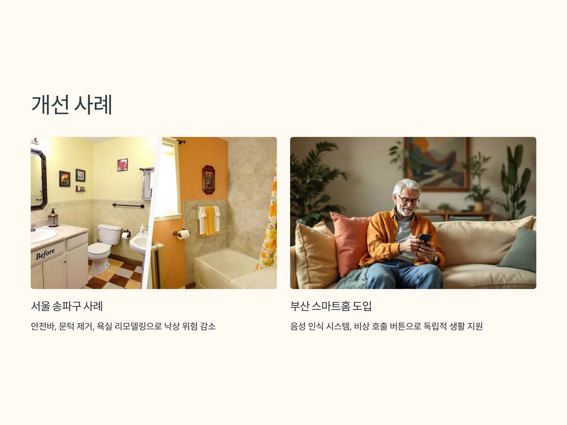 - 내용: 미끄럼 방지, 안전바 설치 등 맞춤형 주택 개조