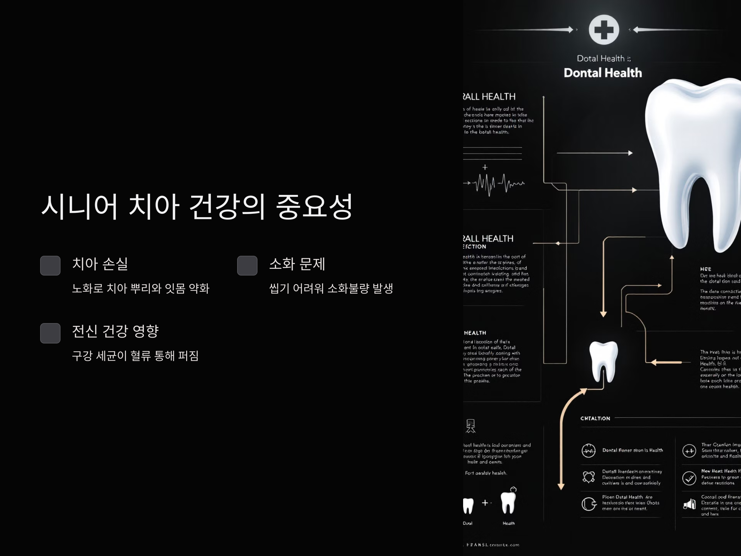 - 치아 손실: 노화로 인해 치아 뿌리와 잇몸이 약화되면서 빠지거나 기능을 잃는 경우가 흔합니다.