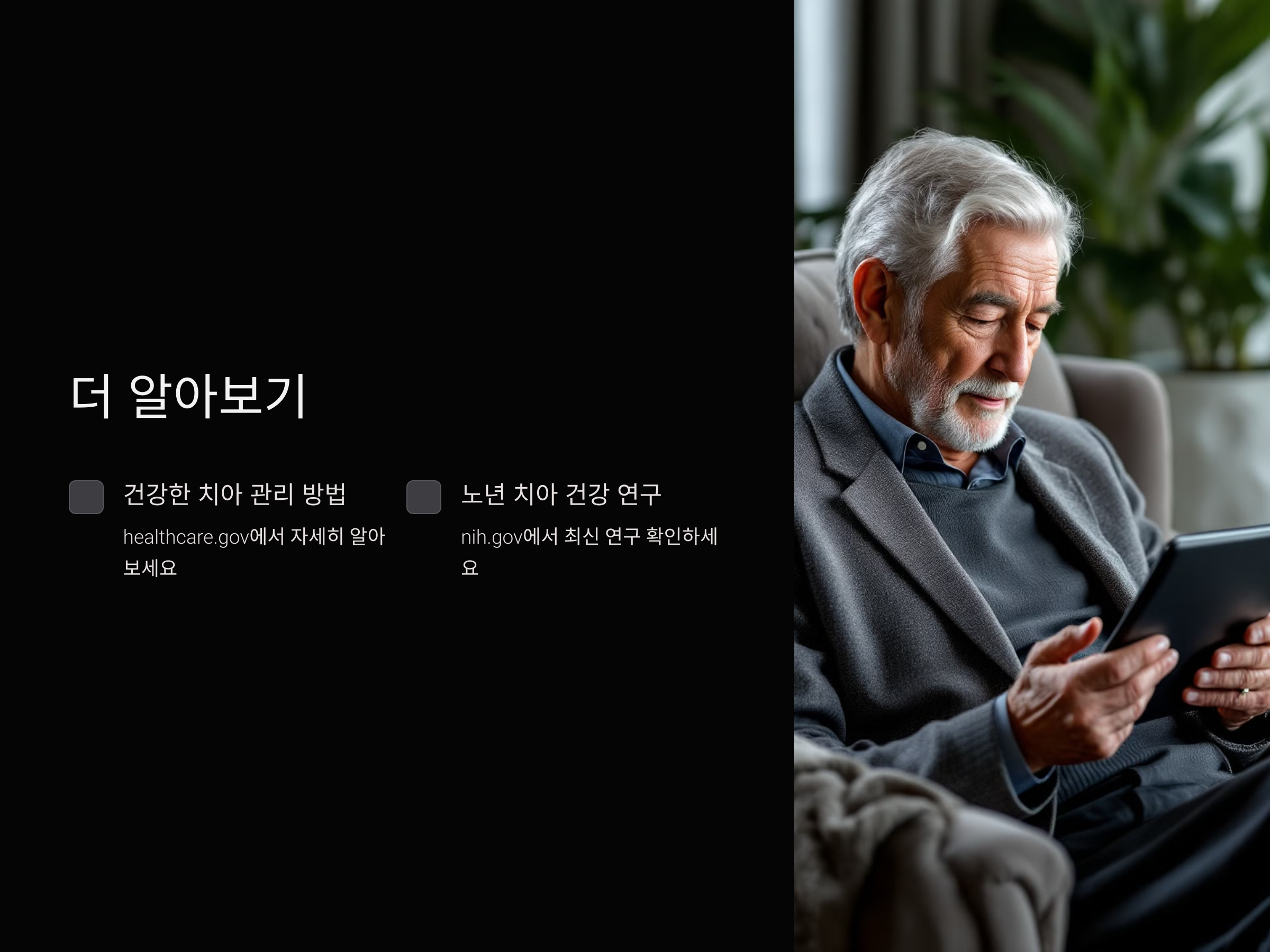 건강한 치아를 유지하는 것만으로도 노년의 삶이 훨씬 편안해질 수 있습니다.