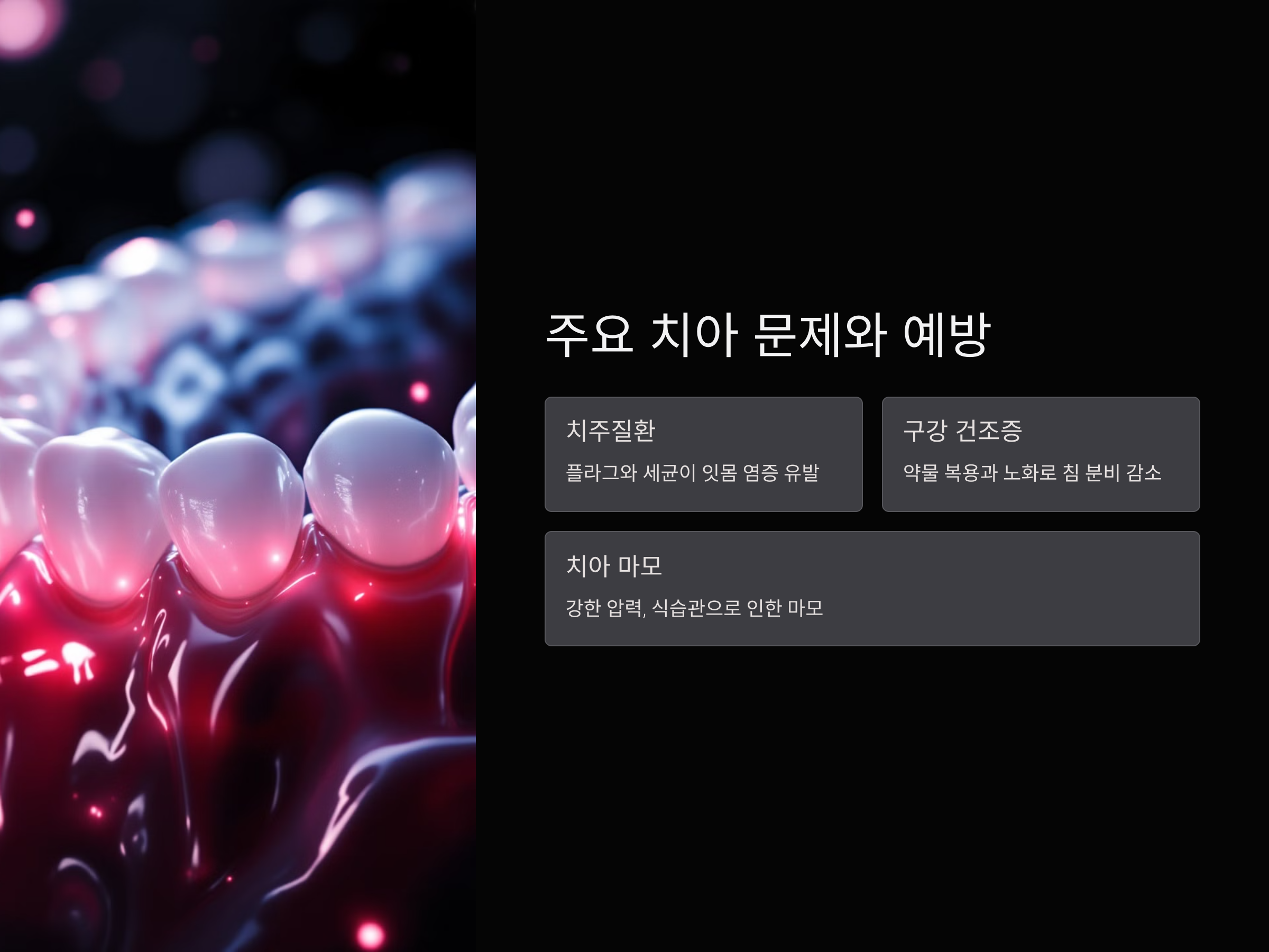 - 원인: 약물 복용과 노화로 인한 침 분비 감소.