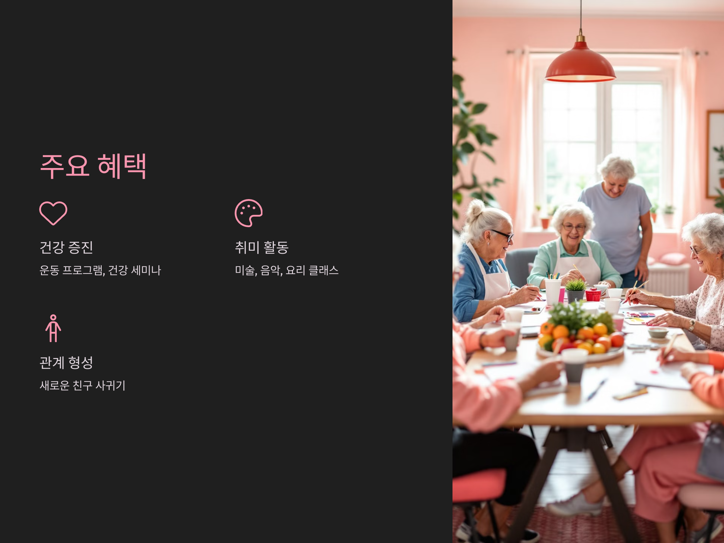 - 건강관리 지원: 운동 클래스, 건강 세미나, 식생활 관리 등 노년 건강에 중점을 둔 프로그램.