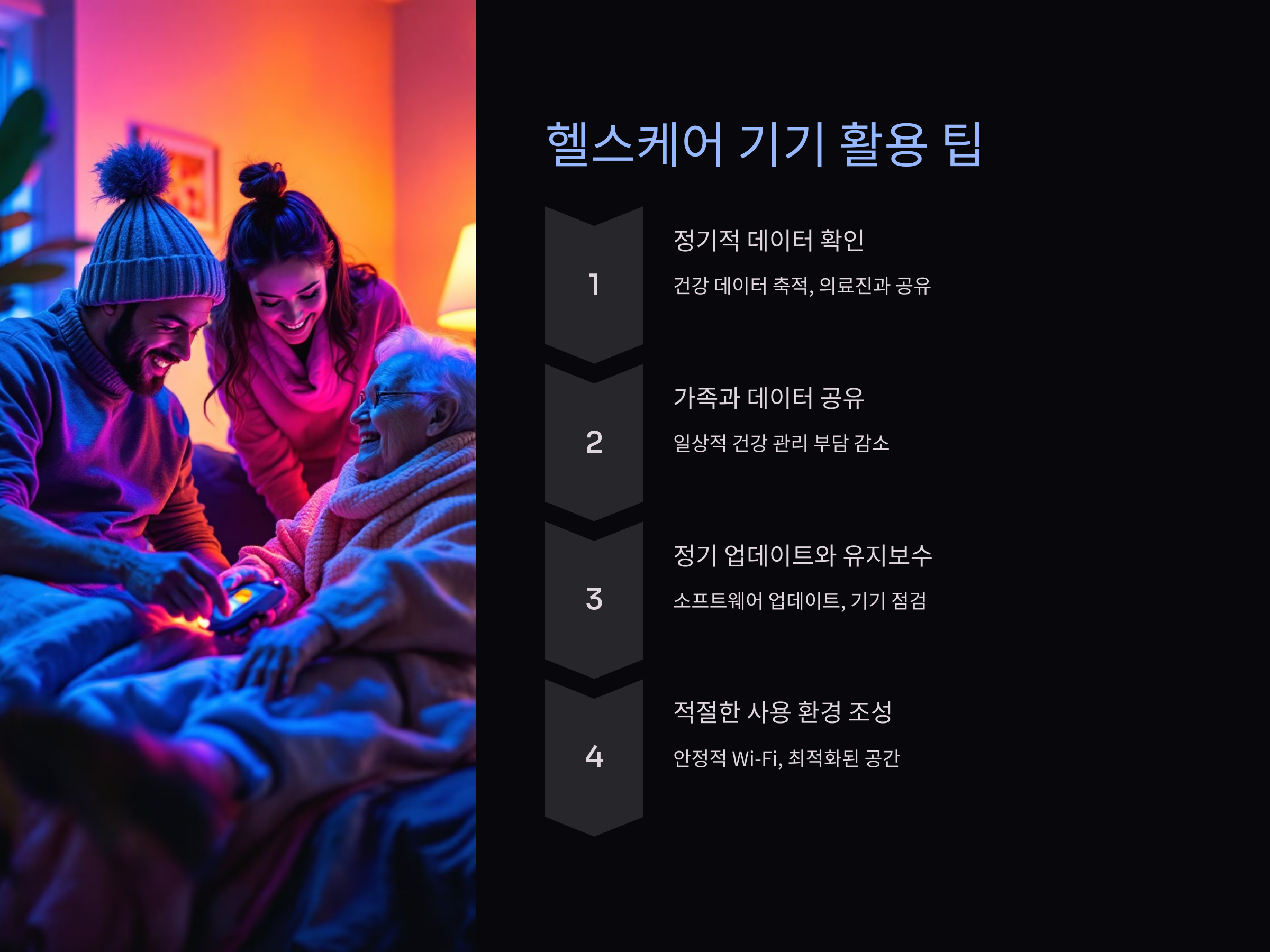 기기의 성능이 최적화될 수 있도록 사용 환경을 조성하세요. 예를 들어, 스마트홈 헬스케어 기기는 Wi-Fi 환경이 안정적인 장소에서 사용해야 효과적입니다.