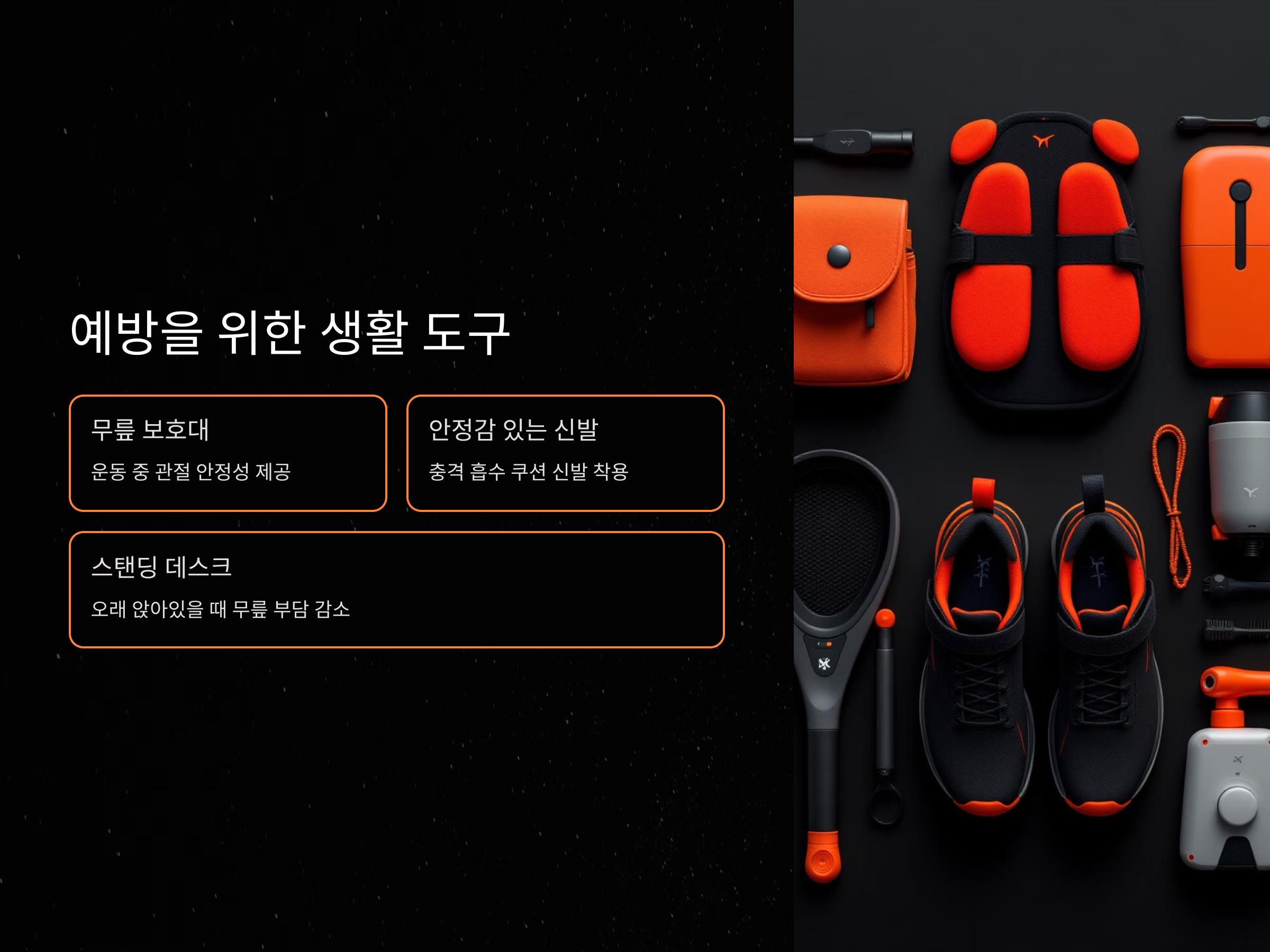 - 무릎 보호대: 운동 중 관절 안정성 제공.