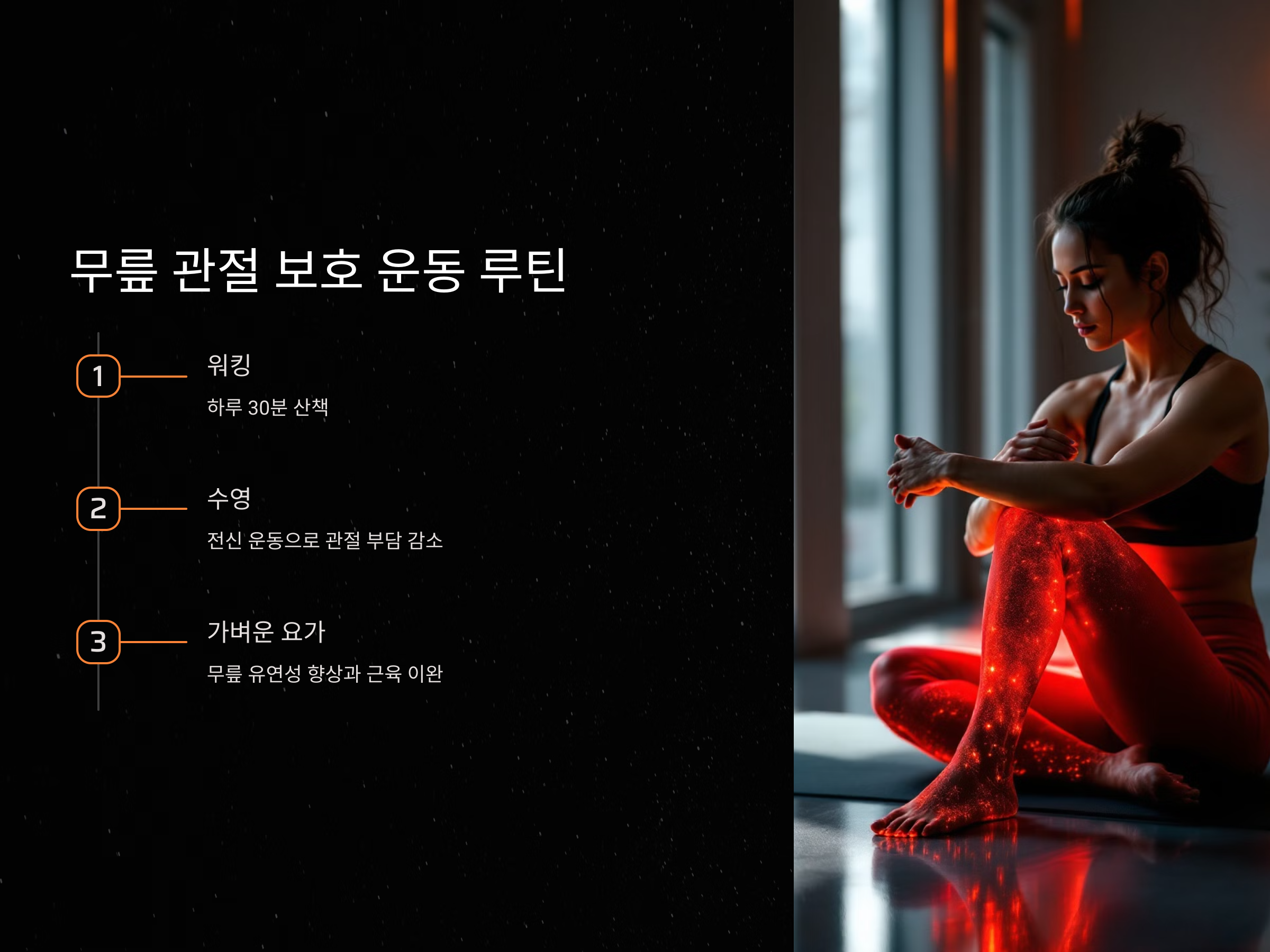 - 가벼운 요가: 무릎의 유연성을 높이고 근육을 이완.