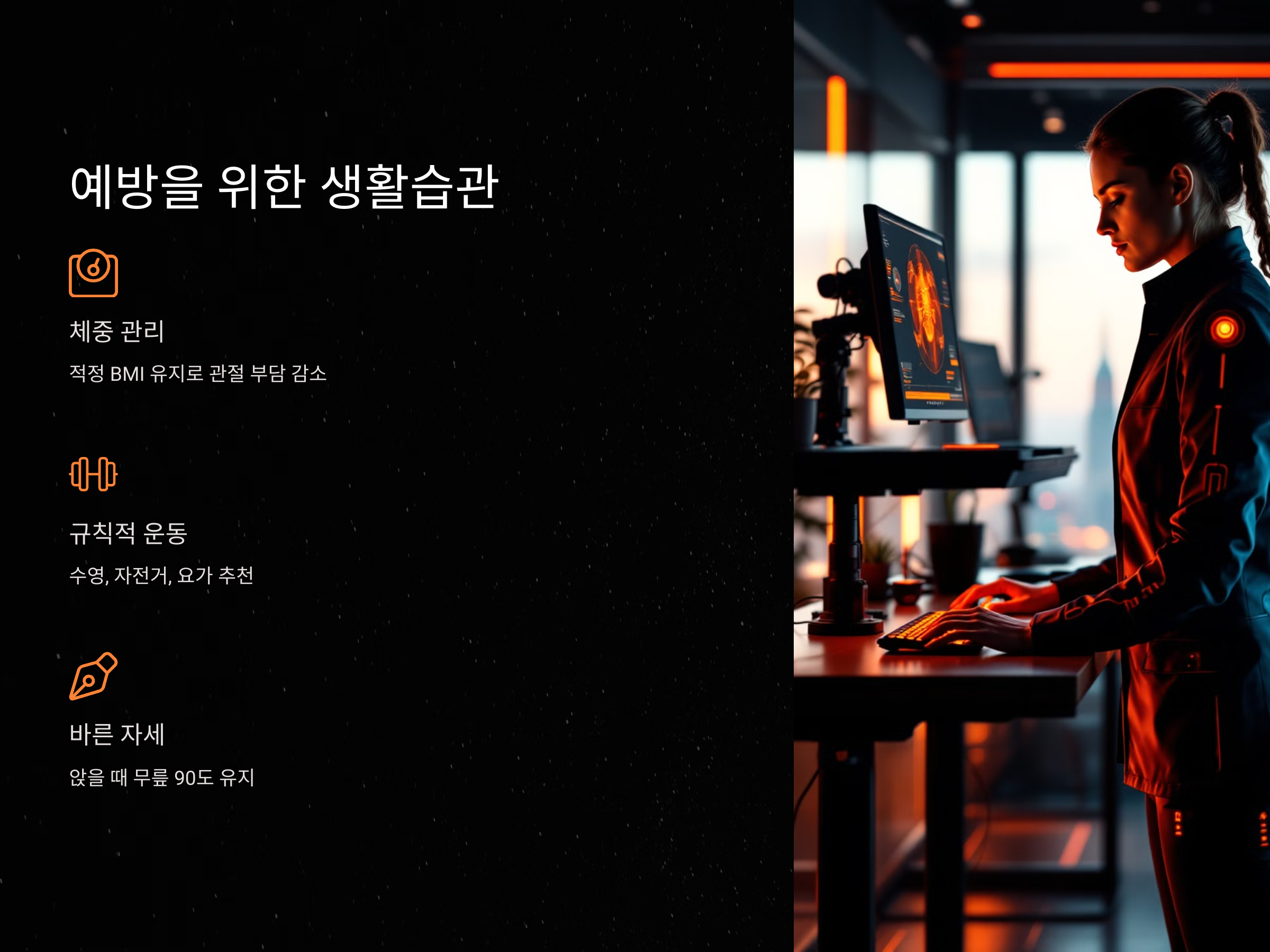 연골 연화증은 예방이 가능한 질환입니다. 일상생활에서 몇 가지 좋은 습관만 실천해도 관절 건강을 지킬 수 있습니다.