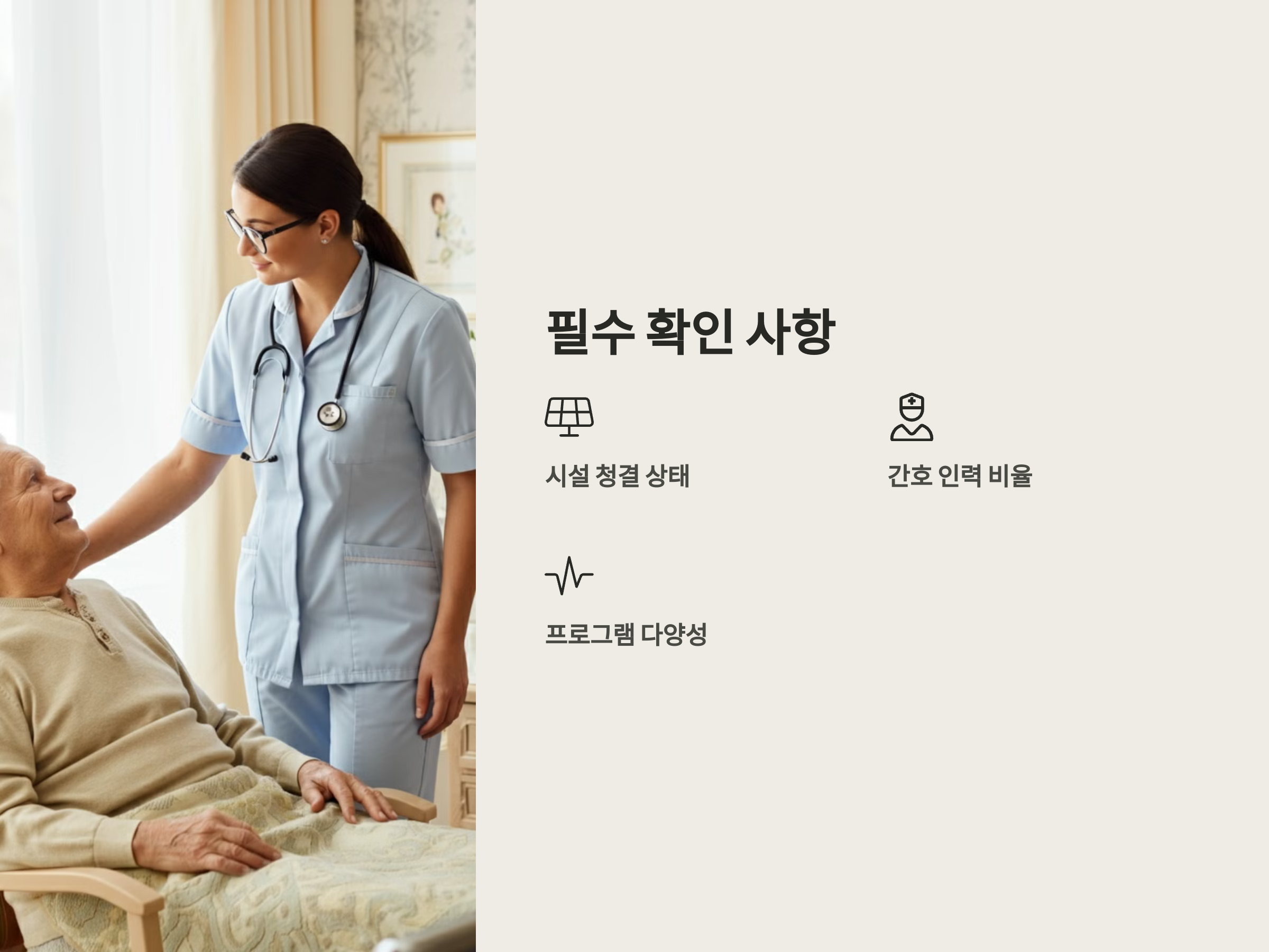요양원 선택 시 다음의 항목을 꼼꼼히 확인하는 것이 필수적입니다: