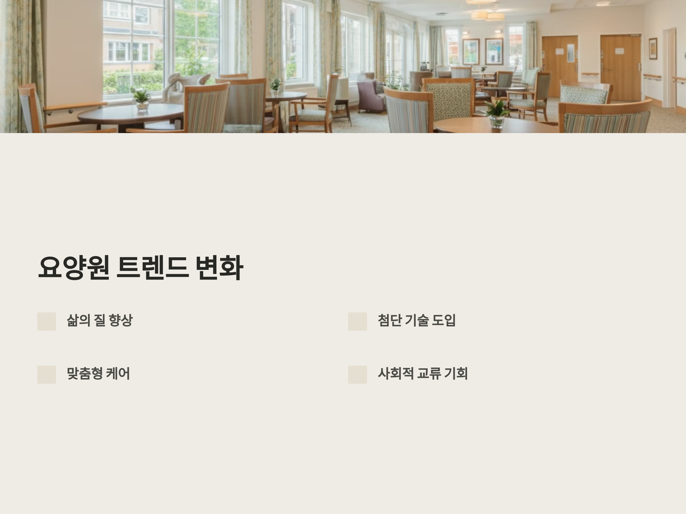이러한 변화는 시니어의 삶을 더 풍요롭게 만들어줍니다. 요양원을 선택할 때 최신 트렌드를 반영하는 시설을 찾는 것이 중요합니다.